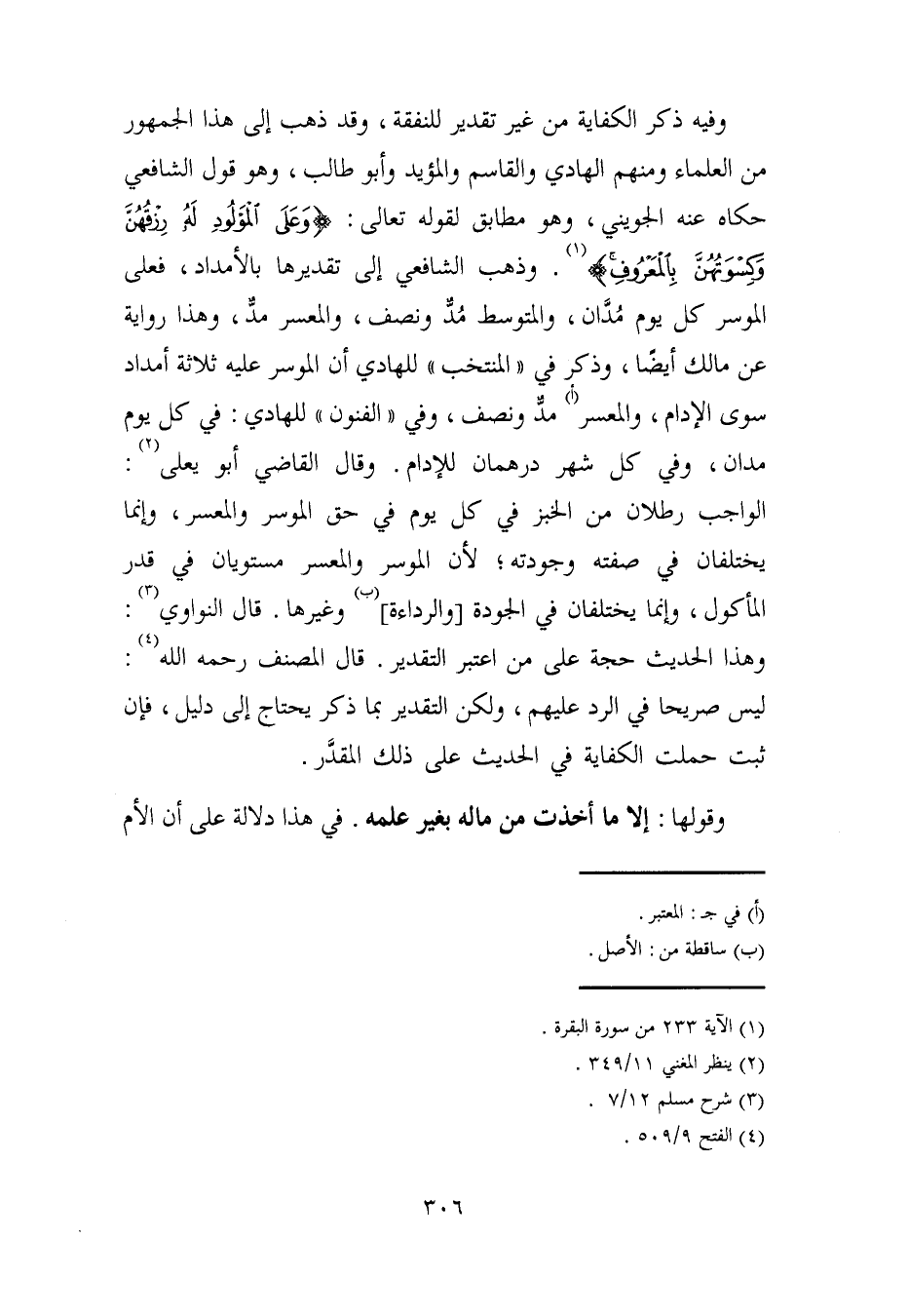 وفيه ذكر الكفاية من غير تقدير للنفقة، وقد ذهب إلى هذا الجمهور من العلماء ومنهم الهادي والقاسم والمؤيد وأبو طالب، وهو قول الشافعي حكاه عنه الجويني، وهو مطابق لقوله تعالى: {وَعَلَى الْمَوْلُودِ لَهُ رِزْقُهُنَّ وَكِسْوَتُهُنَّ بِالْمَعْرُوفِ} (¬1). وذهب الشافعي إلى تقديرها بالأمداد، فعلى الموسر كل يوم مُدَّان، والمتوسط مُدٌّ ونصف، والمعسر مدٌّ، وهذا رواية عن مالك أيضًا، وذكبر في "المنتخب" للهادي أن الموسر عليه ثلاثة أمداد سوى الإدام، والمعسر (أ) مدٌّ ونصف، وفي "الفنون" للهادي: في كل يوم مدان، وفي كل شهر درهمان للإدام. وقال القاضي أبو يعلى (¬2): الواجب رطلان من الخبز في كل يوم في حق الموسر والمعسر، وإنما يختلفان في صفته وجودته؛ لأن الموسر والمعسر مستويان في قدر المأكول، وإنما يختلفان في الجودة [والرداءة] (ب) وغيرها. قال النواوي (¬3): وهذا الحديث حجة على من اعتبر التقدير. قال المصنف رحمه الله (¬4): ليس صريحا في الرد عليهم، ولكن التقدير بما ذكر يحتاج إلى دليل، فإن ثبت حملت الكفاية في الحديث على ذلك المقدَّر.