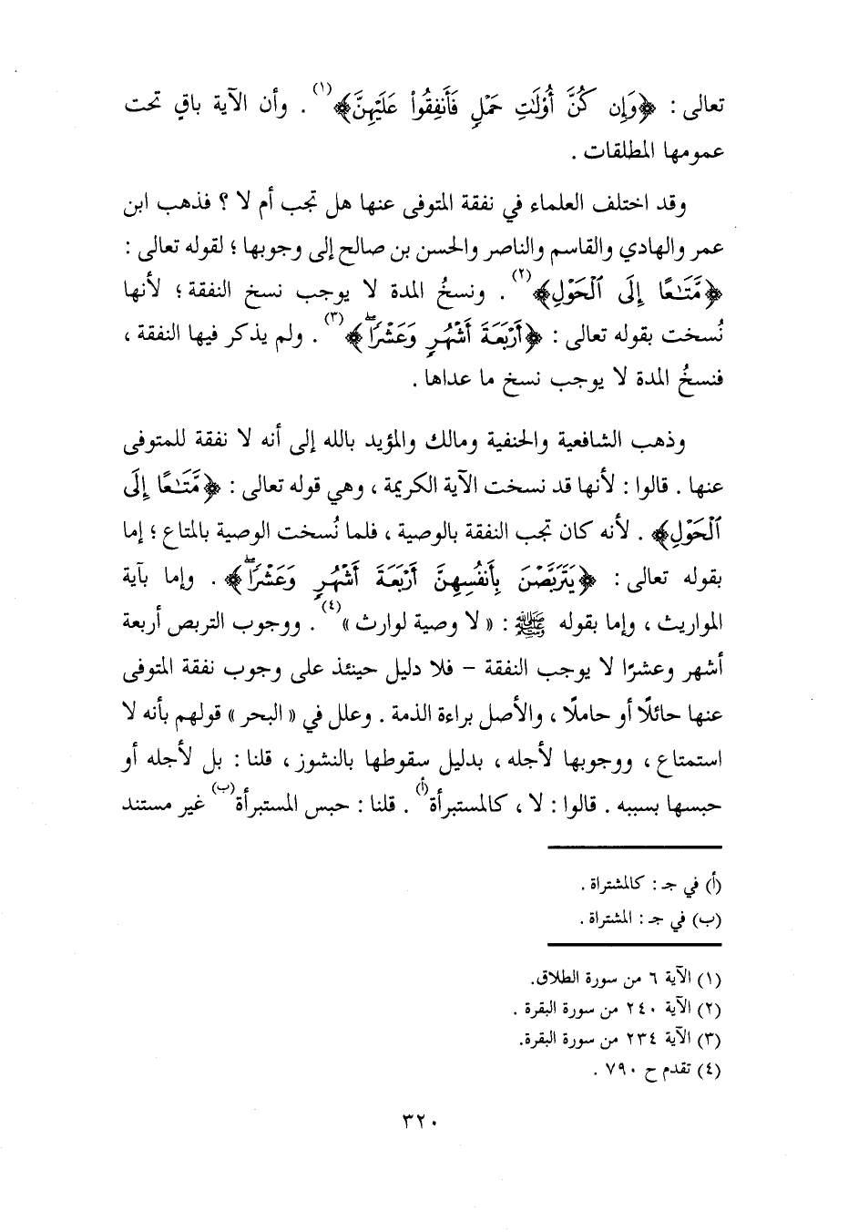وقد اختلف العلماء في نفقة المتوفى عنها هل تجب أم لا؟ فذهب ابن عمر والهادي والقاسم والناصر والحسن بن صالح إلى وجوبها؛ لقوله تعالى: {مَتَاعًا إِلَى الْحَوْلِ} (¬2). ونسخُ المدة لا يوجب نسخ النفقة؛ لأنها نُسخت بقوله تعالى: {أَرْبَعَةَ أَشْهُرٍ وَعَشْرًا} (¬3). ولم يذكر فيها النفقة، فنسخُ المدة لا يوجب نسخ ما عداها.