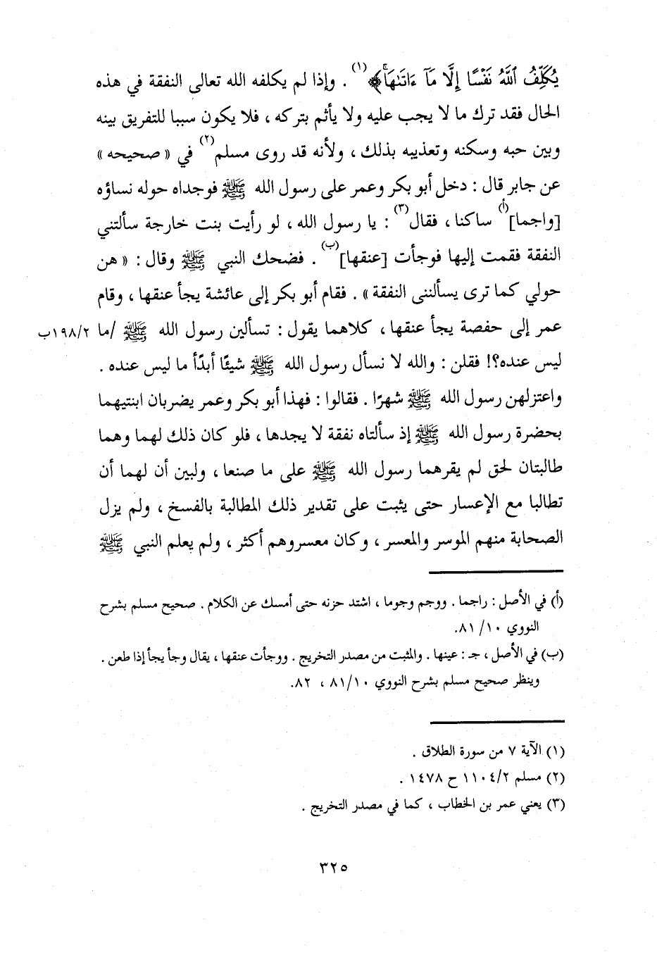لَا يُكَلِّفُ اللَّهُ نَفْسًا إلا مَا آتَاهَا} (¬1). وإذا لم يكلفه الله تعالى النفقة في هذه الحال فقد ترك ما لا يجب عليه ولا يأثم بتركه، فلا يكون سببا للتفريق بينه وبين حبه وسكنه وتعذيبه بذلك، ولأنه قد روى مسلم (¬2) في "صحيحه" عن جابر قال: دخل أبو بكر وعمر على رسول الله - صلى الله عليه وسلم - فوجداه حوله نساؤه [واجما] (أ) ساكنا، فقال (¬3): يا رسول الله، لو رأيت بنت خارجة سألتني النفقة فقمت إليها فوجأت [عنقها] (ب). فضحك النبي - صلى الله عليه وسلم - وقال: "هن حولي كما ترى يسألننى النفقة". فقام أبو بكر إلى عائشة يجأ عنقها، وقام عمر إلى حفصة يجأ عنقها، كلاهما يقول: تسألين رسول الله - صلى الله عليه وسلم - ما ليس عنده؟! فقلق: والله لا نسأل رسول الله - صلى الله عليه وسلم - شيئًا أبدًا ما ليس عنده. واعتزلهن رسول الله - صلى الله عليه وسلم - شهرًا. فقالوا: فهذا أبو بكر وعمر يضربان ابنتيهما بحضرة رسول الله - صلى الله عليه وسلم - إذ سألتاه نفقة لا يجدها، فلو كان ذلك لهما وهما طالبتان لحق لم يقرهما رسول الله - صلى الله عليه وسلم - على ما صنعا، ولبين أن لهما أن تطالبا مع الإعسار حتَّى يثبت على تقدير ذلك المطالبة بالفسخ، ولم يزل الصحابة منهم الموسر والمعسر، وكان معسروهم أكثر، ولم يعلم النبي - صلى الله عليه وسلم -
