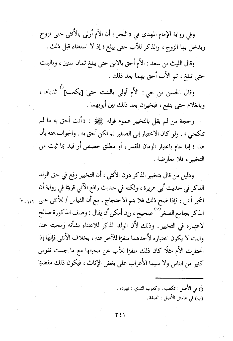 ودليل من قال بتخيير الذكر دون الأنثى، أن التخيير وقع في حق الولد الذكر في حديث أبي هريرة، ولكنه في حديث رافع الآتي قريبًا في رواية أن المخير أنثى، فإذا صح ذلك فلا يتم الاحتجاج، مع أن القياس للأنثى على الذكر بجامع الصغر (ب) صحيح، وإن أمكن أن يقال: وصف الذكورة صالح لاعتباره في التخيير. وذلك لأن الولد الذكر للاعتناء بشأنه ومحبته عند والدته لا يكون اختياره لأحدهما منفرًا للآخر عنه، بخلاف الأنثى فإنها إذا اختارت الأم مثلًا كان ذلك منفرًا للأب عن محبتها مع ما جبلت نفوس كثير من الناس ولا سيما الأعراب على بغض الإناث، فيكون ذلك مفضيًا
