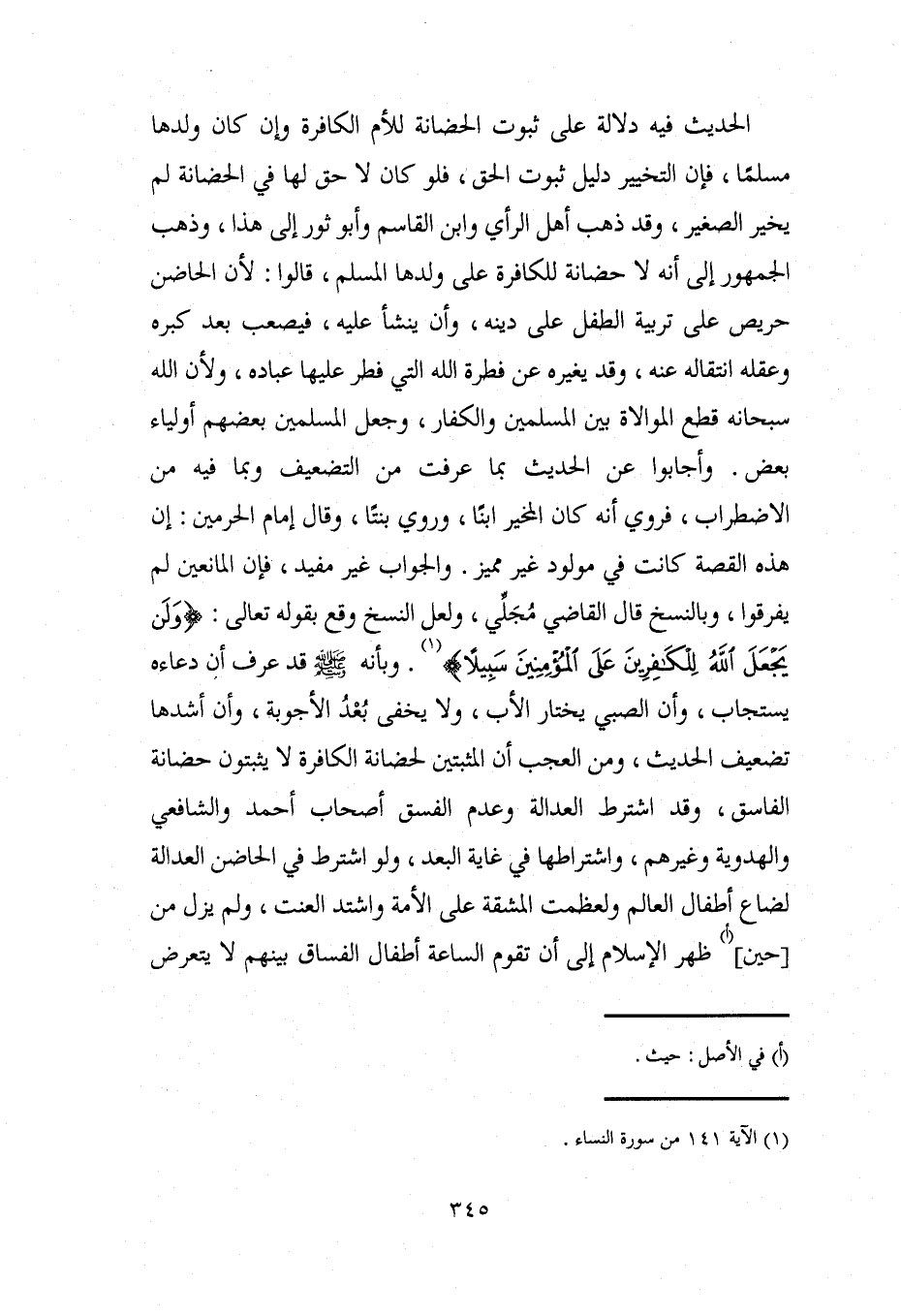 الحديث فيه دلالة على ثبوت الحضانة للأم الكافرة وإن كان ولدها مسلمًا، فإن التخيير دليل ثبوت الحق، فلو كان لا حق لها في الحضانة لم يخير الصغير، وقد ذهب أهل الرأي وابن القاسم وأبو ثور إلى هذا، وذهب الجمهور إلى أنه لا حضانة للكافرة على ولدها المسلم، قالوا: لأن الحاضن حريص على تربية الطفل على دينه، وأن ينشأ عليه، فيصعب بعد كبره وعقله انتقاله عنه، وقد يغيره عن فطرة الله التي فطر عليها عباده، ولأن الله سبحانه قطع الموالاة بين المسلمين والكفار، وجعل المسلمين بعضهم أولياء بعض. وأجابوا عن الحديث بما عرفت من التضعيف وبما فيه من الاضطراب، فروي أنه كان الخير ابنًا، وروي بنتًا، وقال إمام الحرمين: إن هذه القصة كانت في مولود غير مميز. والجواب غير مفيد، فإن المانعين لم يفرقوا، وبالنسخ قال القاضي مُجَلِّي، ولعل النسخ وقع بقوله تعالى: {وَلَنْ يَجْعَلَ اللَّهُ لِلْكَافِرِينَ عَلَى الْمُؤْمِنِينَ سَبِيلً} (¬1). وبأنه هو قد عرف أن دعاءه يستجاب، وأن الصبي يختار الأب، ولا يخفى بُعدُ الأجوبة، وأن أشدها تضعيف الحديث، ومن العجب أن المثبتين لحضانة الكافرة لا يثبتون حضانة الفاسق، وقد اشترط العدالة وعدم الفسق أصحاب أحمد والشافعي والهدوية وغيرهم، واشتراطها في غاية البعد، ولو اشترط في الحاضن العدالة لضاع أطفال العالم ولعظمت المشقة على الأمة واشتد العنت، ولم يزل من [حين] (أ) ظهر الإسلام إلى أن تقوم الساعة أطفال الفساق بينهم لا يتعرض
