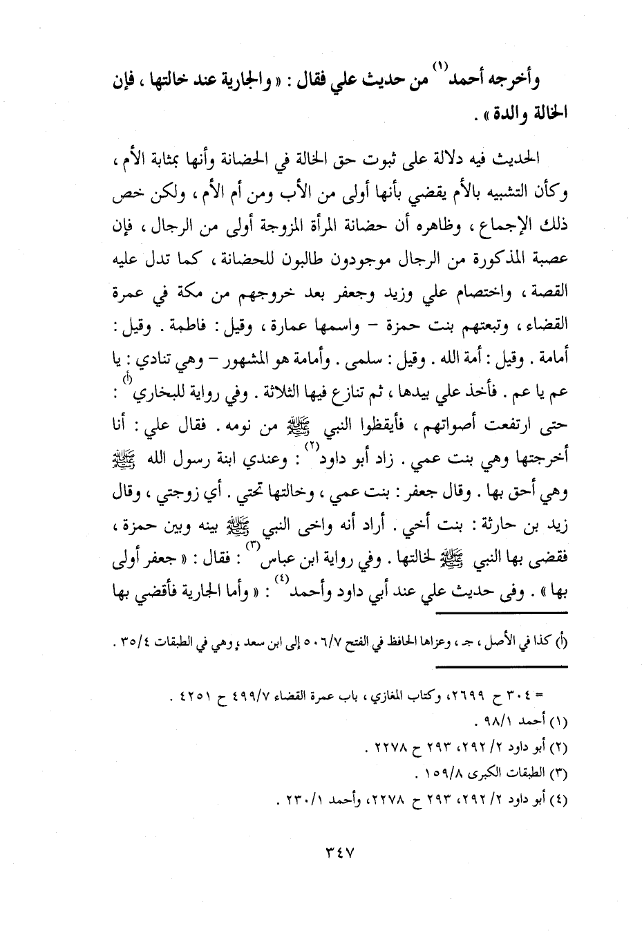 الحديث فيه دلالة على ثبوت حق الخالة في الحضانة وأنها بمثابة الأم، وكأن التشبيه بالأم يقضي بأنها أولى من الأب ومن أم الأم، ولكن خص ذلك الإجماع، وظاهره أن حضانة المرأة المزوجة أولى من الرجال، فإن عصبة المذكورة من الرجال موجودون طالبون للحضانة، كما تدل عليه القصة، واختصام علي وزيد وجعفر بعد خروجهم من مكة في عمرة القضاء، وتبعتهم بنت حمزة -واسمها عمارة، وقيل: فاطمة. وقيل: أمامة. وقيل: أمة الله. وقيل: سلمى. وأمامة هو المشهور- وهي تنادي: يا عم يا عم. فأخذ علي بيدها، ثم تنازع فيها الثلاثة. وفي رواية للبخاري (أ): حتى ارتفعت أصواتهم، فأيقظوا النبي - صلى الله عليه وسلم - من نومه. فقال علي: أنا أخرجتها وهي بنت عمي. زاد أبو داود (¬2): وعندي ابنة رسول الله - صلى الله عليه وسلم - وهي أحق بها. وقال جعفر: بنت عمي، وخالتها تحتي. أي زوجتي، وقال زيد بن حارثة: بنت أخي. أراد أنه وآخى النبي - صلى الله عليه وسلم - بينه وبين حمزة، فقضى بها النبي - صلى الله عليه وسلم - لخالتها. وفي رواية ابن عباس (¬3): فقال: "جعفر أولى بها". وفي حديث علي عند أبي داود وأحمد (¬4): "وأما الجارية فأقضي بها
