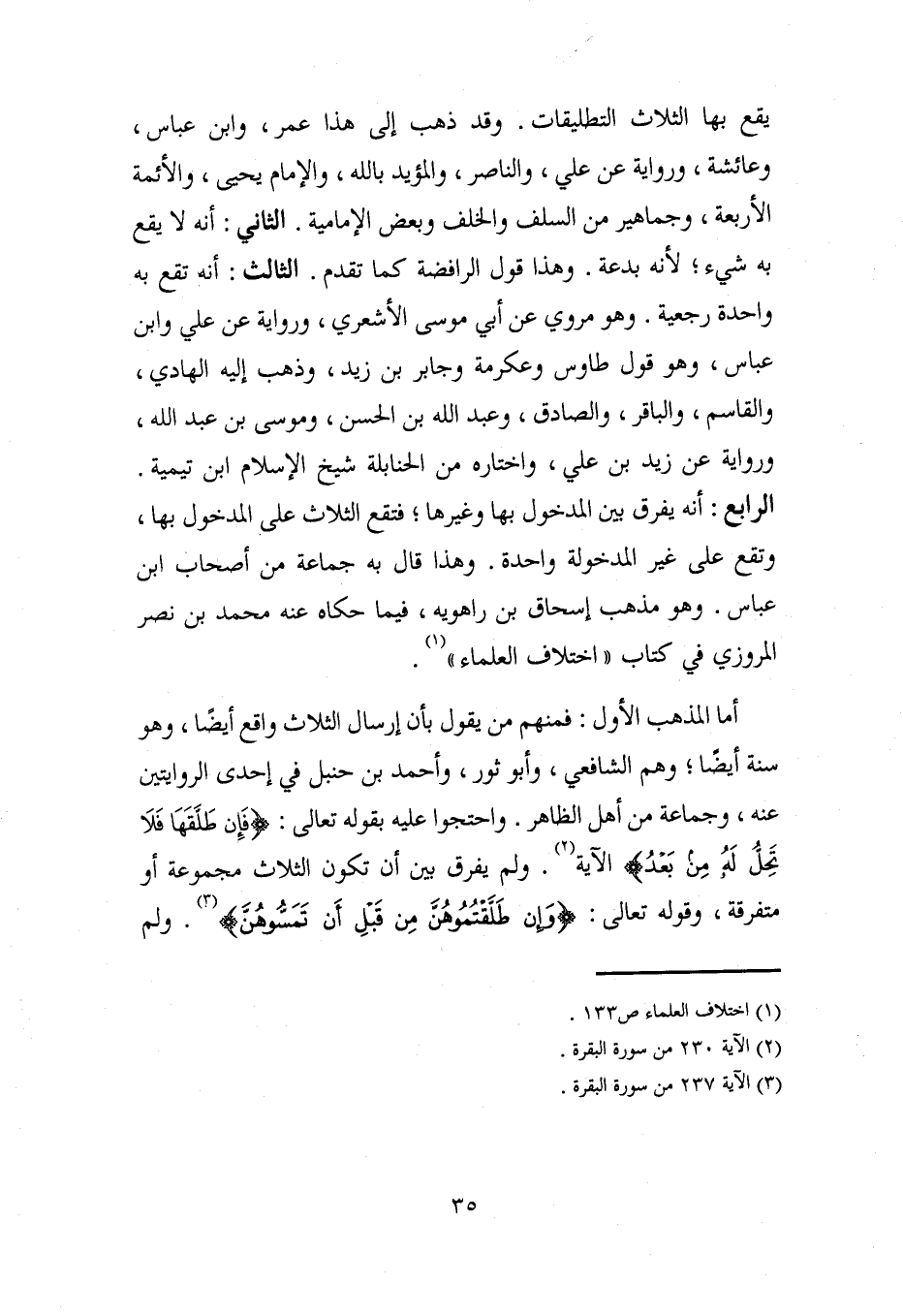أما المذهب الأول: فمنهم من يقول بأن إرسال الثلاث واقع أيضًا، وهو سنة أيضًا؛ وهم الشافعي، وأبو ثور، وأحمد بن حنبل في إحدى الروايتين عنه، وجماعة من أهل الظاهر. واحتجوا عليه بقوله تعالى: {فَإِنْ طَلَّقَهَا فَلَا تَحِلُّ لَهُ مِنْ بَعْدُ} الآية (¬2). ولم يفرق بين أن تكون الثلاث مجموعة أو متفرقة، وقوله تعالى: {وَإِنْ طَلَّقْتُمُوهُنَّ مِنْ قَبْلِ أَنْ تَمَسُّوهُنَّ} (¬3). ولم