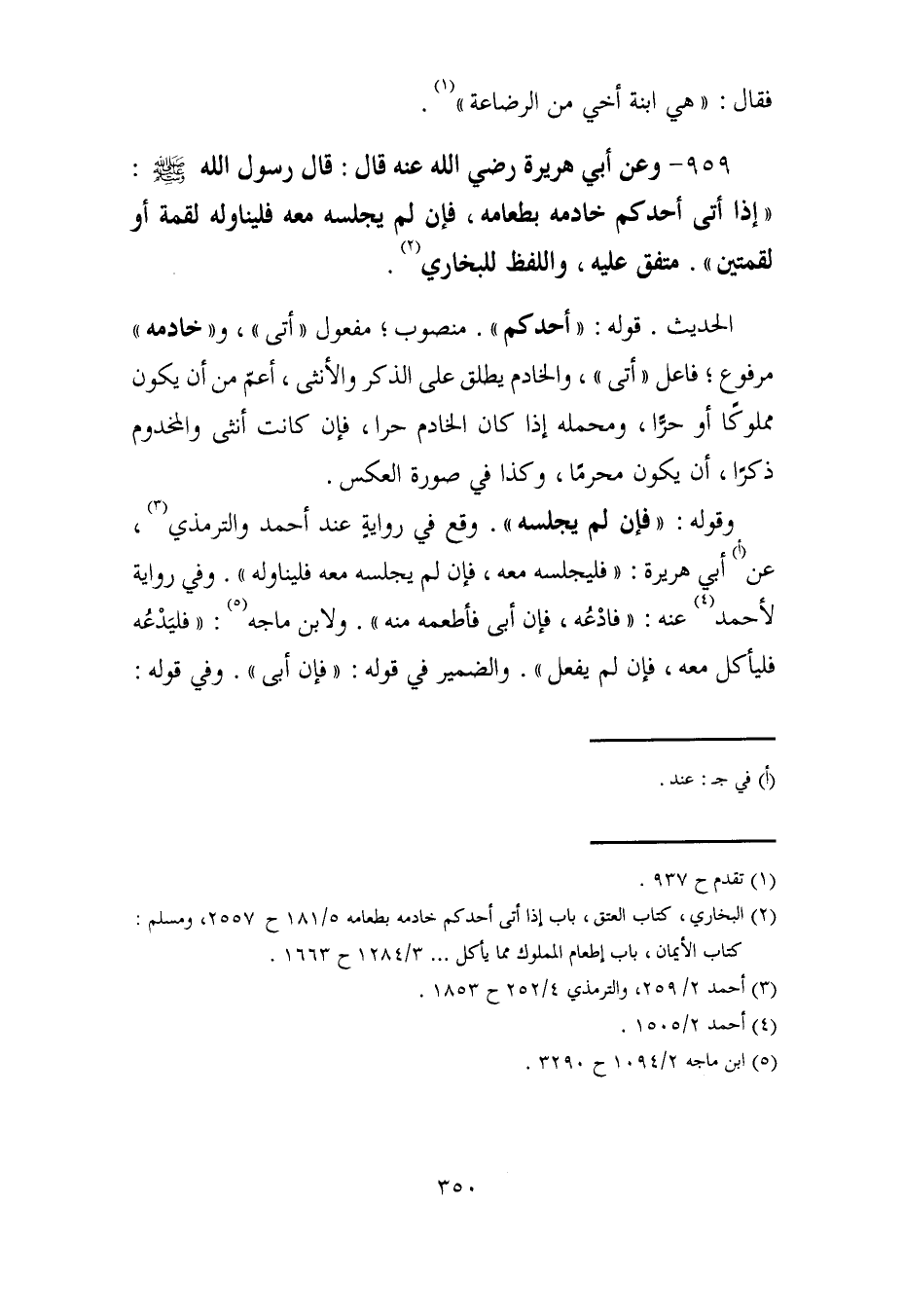 (¬2) البخاري، كتاب العتق، باب إذا أتى أحدكم خادمه بطعامه 5/ 181 ح 2557، ومسلم: كتاب الأيمان، باب إطعام المملوك مما يأكل ...... 3/ 1284 ح 1663.