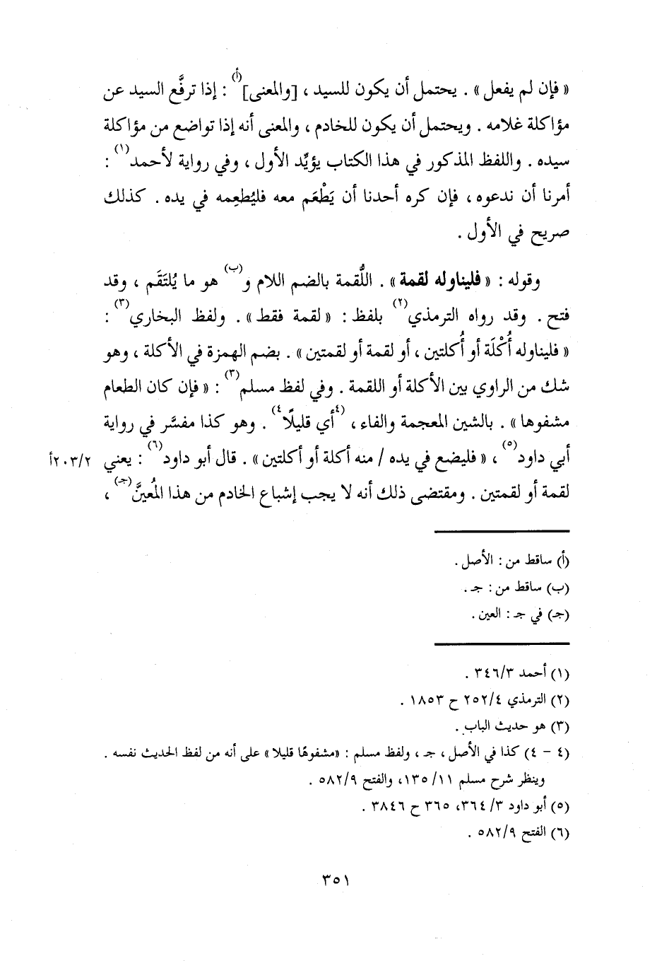 وقوله: "فليناوله لقمة". اللُّقمة بالضم اللام و (ب) هو ما يُلتَقَم، وقد فتح. وقد رواه الترمذي (¬2) بلفظ: "لقمة فقط". ولفظ البخاري (¬3): "فليناوله أُكْلَة أو أُكلتين، أو لقمة أو لقمتين". بضم الهمزة في الأكلة، وهو شك من الراوي بين الأكلة أو اللقمة. وفي لفظ مسلم (3): "فإن كان الطعام مشفوها". بالشين المعجمة والفاء، أي قليلًا (¬4) وهو كذا مفسَّر في رواية أبي داود (¬5)، "فليضع في يده منه أكلة أو أكلتين". قال أبو داود (¬6): يعني لقمة أو لقمتين. ومقتضى ذلك أنه لا يجب إشباع الخادم من هذا المُعيَّن (جـ)،