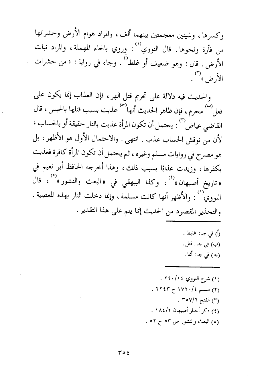 والحديث فيه دلالة على تحريم قتل الهر، فإن العذاب إنما يكون على فعل (ب) محرم، فإن ظاهر الحديث أنها (جـ) عذبت بسبب قتلها بالحبس، قال القاضي عياض (¬3): يحتمل أن تكون المرأة عذبت بالنار حقيقة أو بالحساب؛ لأن من نوقش الحساب عذب. انتهى. والاحتمال الأول هو الأظهر، بل هو مصرح في روايات مسلم وغيره، ثم يحتمل أن تكون المرأة كافرة فعذبت بكفرها، وزيدت عذابًا بسبب ذلك، وهذا أخرجه الحافظ أبو نعيم في "تاريخ أصبهان" (¬4)، وكذا البيهقي في "البعث والنشور" (¬5)، قال النووي (1): والأظهر أنها كانت مسلمة، وإنما دخلت النار بهذه المعصية. والتحذير المقصود من الحديث إنما يتم على هذا التقدير.