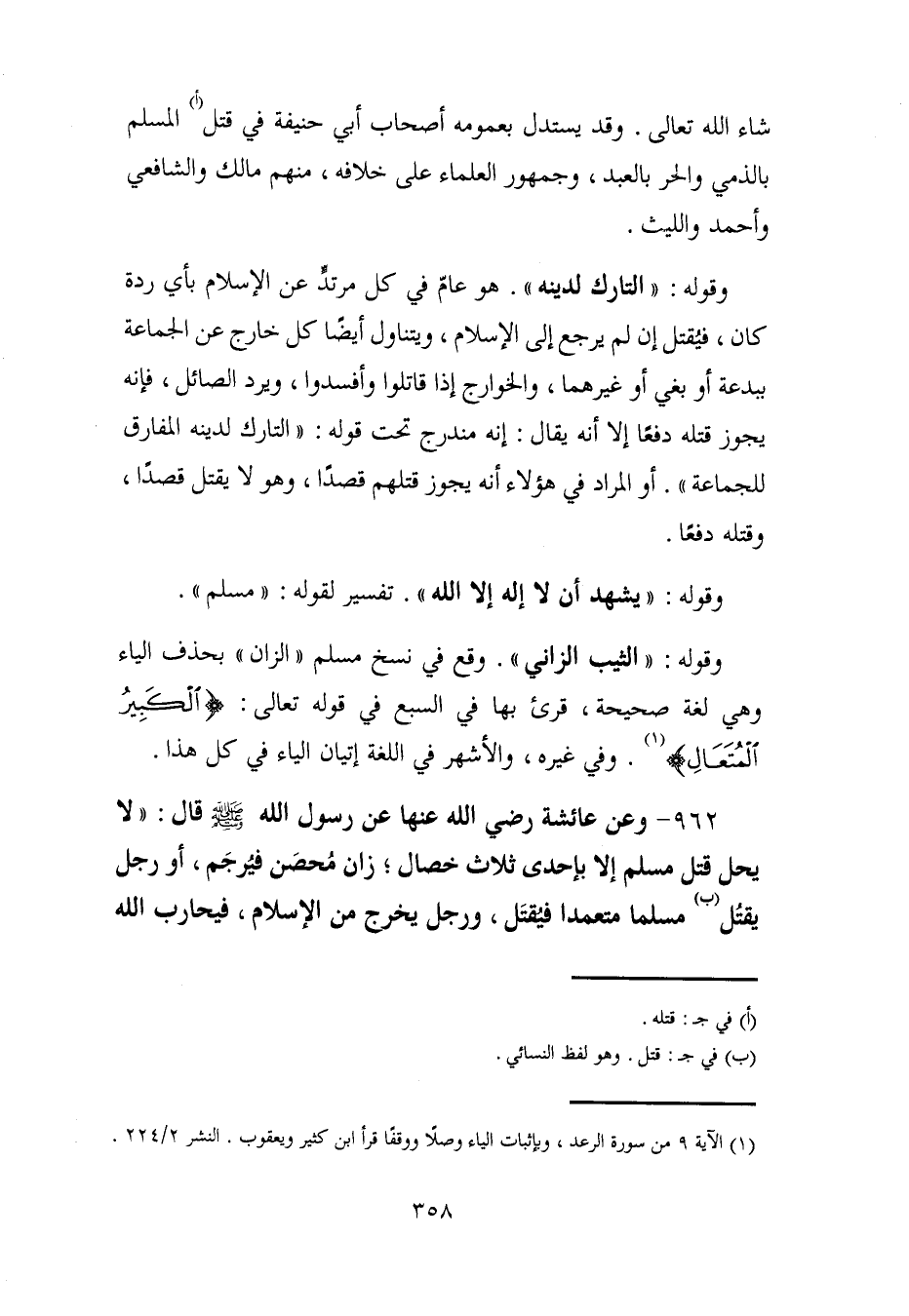 962 - وعن عائشة رضي الله عنها عن رسول الله - صلى الله عليه وسلم - قال: "لا يحل قتل مسلم إلا بإحدى ثلاث خصال؛ زان مُحصَن فيُرجَم، أو رجل يقتُل (ب) مسلما متعمدا فيُقتَل، ورجل يخرج من الإسلام، فيحارب الله