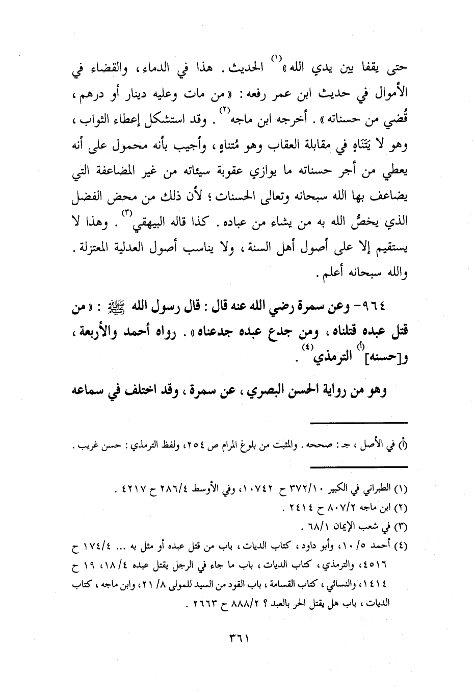 964 - وعن سمرة رضي الله عنه قال: قال رسول الله - صلى الله عليه وسلم -: "من قتل عبده قتلناه، ومن جدع عبده جدعناه". رواه أحمد والأربعة، و [حسنه] (أ) الترمذي (¬4).