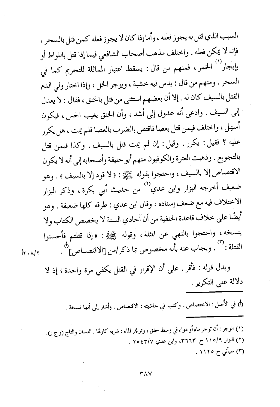 السبب الذي قتل به يجوز فعله، وأما إذا كان لا يجوز فعله كمن قتل بالسحر، فإنه لا يمكن فعله. واختلف مذهب أصحاب الشافعي فيما إذا قتل باللواط أو بإيجار (¬1) الخمر، فمنهم من قال: يسقط اعتبار المماثلة للتحريم كما في السحر. ومنهم من قال: يدس فيه خشبة، ويوجر الخل، وإذا اختار ولي الدم القتل بالسيف كان له. إلا أن بعضهم استثنى من قتل بالخنق، فقال: لا يعدل إلى السيف. وادعى أنه عدول إلى أشد، وأن الخنق يغيب الحس، فيكون أسهل، واختلف فيمن قتل بعصا فاقتص بالضرب بالعصا فلم يمت، هل يكرر عليه؟ فقيل: يكرر. وقيل: إن لم يمت قتل بالسيف. وكذا فيمن قتل بالتجويع. وذهبت العترة والكوفيون منهم أبو حنيفة وأصحابه إلى أنه لا يكون الاقتصاص إلا بالسيف، واحتجوا بقوله - صلى الله عليه وسلم -: "لا قود إلا بالسيف". وهو ضعيف أخرجه البزار وابن عدي (¬2) من حديث أبي بكرة، وذكر البزار الاختلاف فيه مع ضعف إسناده، وقال ابن عدي: طرقه كلها ضعيفة. وهو أيضًا على خلاف قاعدة الحنفية من أن آحادي السنة لا يخصص الكتاب ولا ينسخه، واحتجوا بالنهي عن المثلة، وقوله - صلى الله عليه وسلم -: "إذا قتلتم فأحسنوا القتلة" (¬3). ويجاب عنه بأنه مخصوص بما ذكر من [الاقتصاص] " (أ).