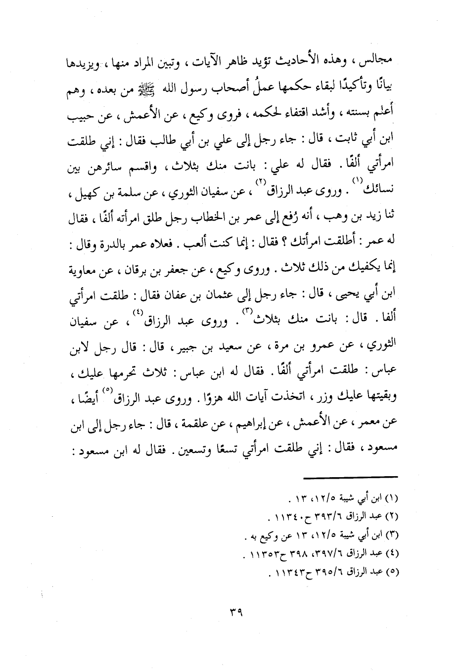 مجالس، وهذه الأحاديث تؤيد ظاهر الآيات، وتبين المراد منها، ويزيدها بيانًا وتأكيدًا لبقاء حكمها عملُ أصحاب رسول الله - صلى الله عليه وسلم - من بعده، وهم أعلم بسنته، وأشد اقتفاء لحكمه، فروى وكيع، عن الأعمش، عن حبيب ابن أبي ثابت، قال: جاء رجل إلى علي بن أبي طالب فقال: إني طلقت امرأتي ألفًا. فقال له علي: بانت منك بثلاث، واقسم سائرهن بين نسائك (¬1). وروى عبد الرزاق (¬2)، عن سفيان الثوري، عن سلمة بن كهيل، ثنا زيد بن وهب، أنه رُفع إلى عمر بن الخطاب رجل طلق امرأته الفًا، فقال له عمر: أطلقت امرأتك؟ فقال: إنما كنت ألعب. فعلاه عمر بالدرة وقال: إنما يكفيك من ذلك ثلاث. وروى وكيع، عن جعفر بن برقان، عن معاوية ابن أبي يحيى، قال: جاء رجل إلى عثمان بن عفان فقال: طلقت امرأتي ألفا. قال: بانت منك بثلاث (¬3). وروى عبد الرزاق (¬4)، عن سفيان الثوري، عن عمرو بن مرة، عن سعيد بن جبير، قال: قال رجل لابن عباس: طلقت امرأتي ألفًا. فقال له ابن عباس: ثلاث تحرمها عليك، وبقيتها عليك وزر، اتخذت آيات الله هزوًا. وروى عبد الرزاق (¬5) أيضًا، عن معمر، عن الأعمش، عن إبراهيم، عن علقمة، قال: جاء رجل إلى ابن مسعود، فقال: إني طلقت امرأتي تسعًا وتسعين. فقال له ابن مسعود: