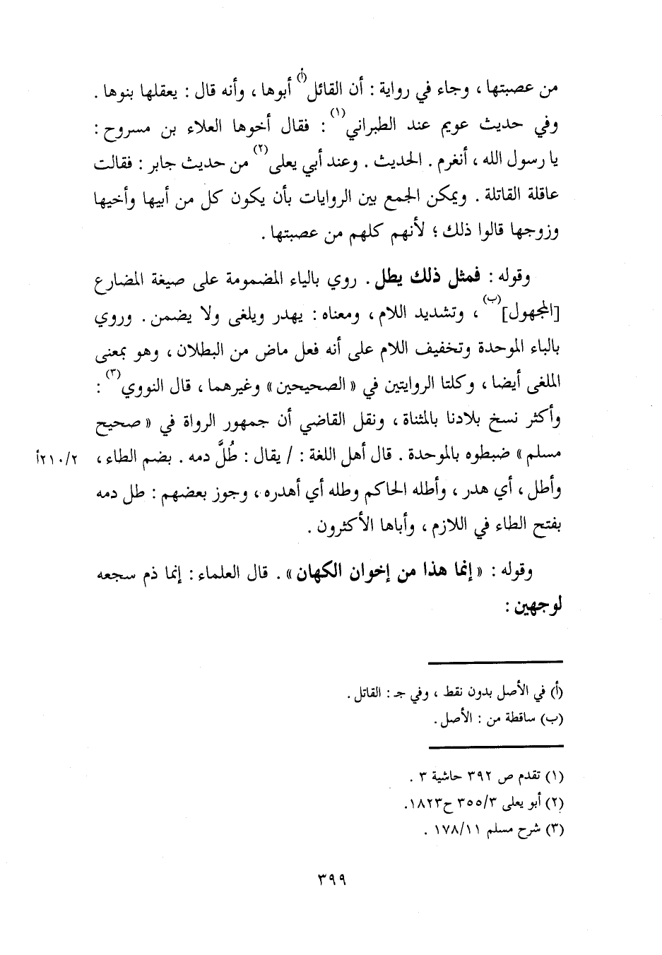 وقوله: فمثل ذلك يطل. روي بالياء المضمومة على صيغة المضارع [المجهول] (ب)، وتشديد اللام، ومعناه: يهدر ويلغى ولا يضمن. وروي بالباء الموحدة وتخفيف اللام على أنه فعل ماض من البطلان، وهو بمعنى الملغى أيضًا، وكلتا الروايتين في "الصحيحين" وغيرهما، قال النووي (¬3): وأكثر نسخ بلادنا بالمثناة، ونقل القاضي أن جمهور الرواة في "صحيح مسلم" ضبطوه بالموحدة. قال أهل اللغة: يقال: طُلَّ دمه. بضم الطاء، وأطل، أي هدر، وأطله الحاكم وطله أي أهدرها، وجوز بعضهم: طل دمه بفتح الطاء في اللازم، وأباها الأكثرون.