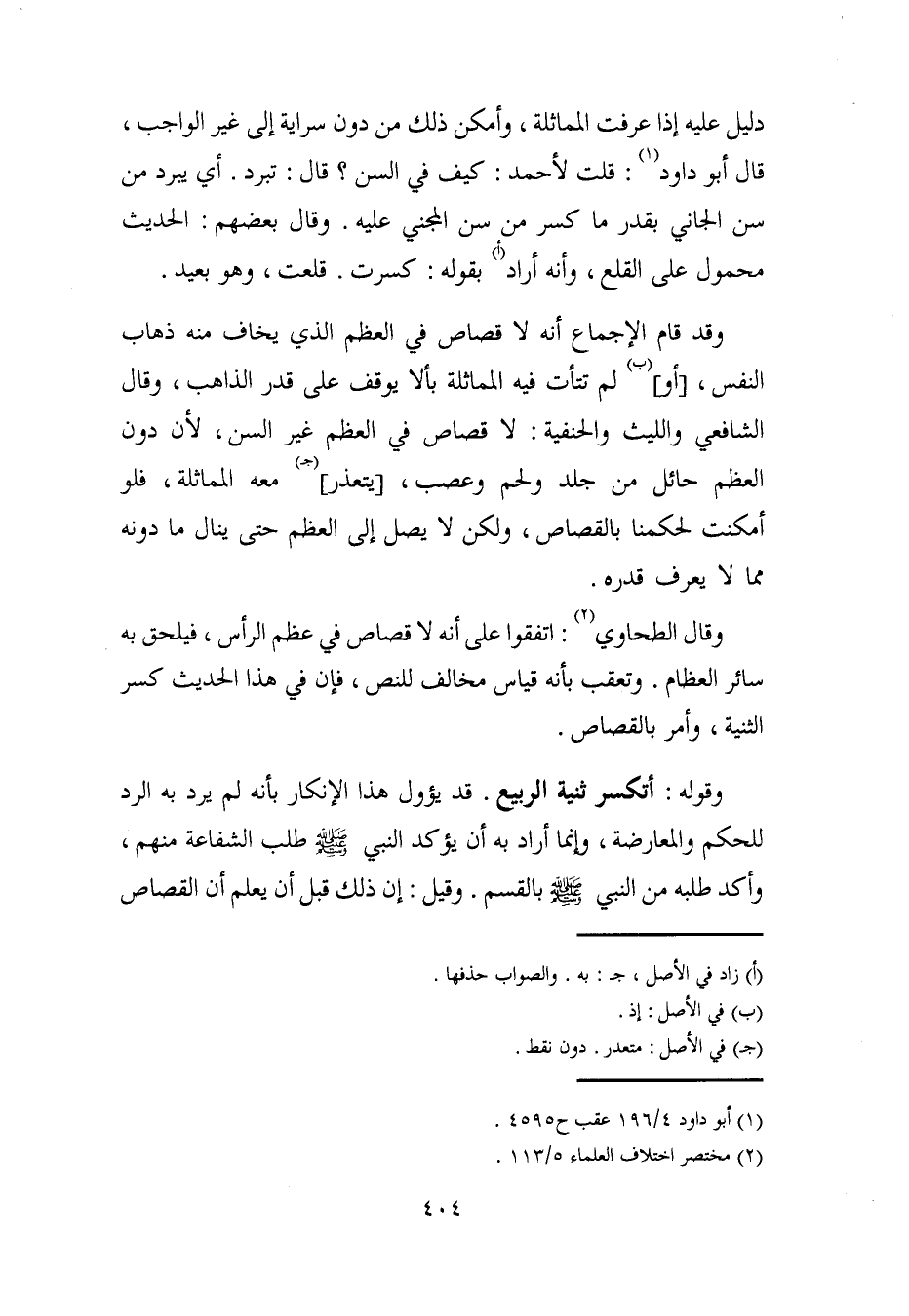 دليل عليه إذا عرفت المماثلة، وأمكن ذلك من دون سراية إلى غير الواجب، قال أبو داود (¬1): قلت لأحمد: كيف في السن؟ قال: تبرد. أي يبرد من سن الجاني بقدر ما كسر من سن المجني عليه. وقال بعضهم: الحديث محمول على القلع، وأنه أراد (أ) بقوله: كسرت. قلعت، وهو بعيد.