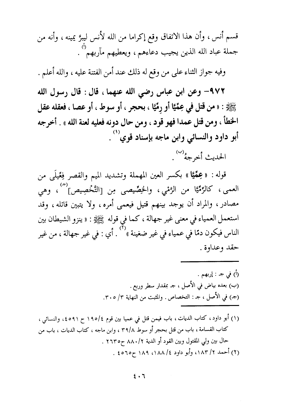 (¬1) أبو داود، كتاب الديات، باب فيمن قتل في عميا بين قوم 4/ 195 ح 4591، والنسائي، كتاب القسامة، باب من قتل بحجر أو سوط 8/ 39، وابن ماجه، كتاب الديات، باب من حال بين ولي المقتول وبين القود أو الدية 2/ 880 ح 2635.