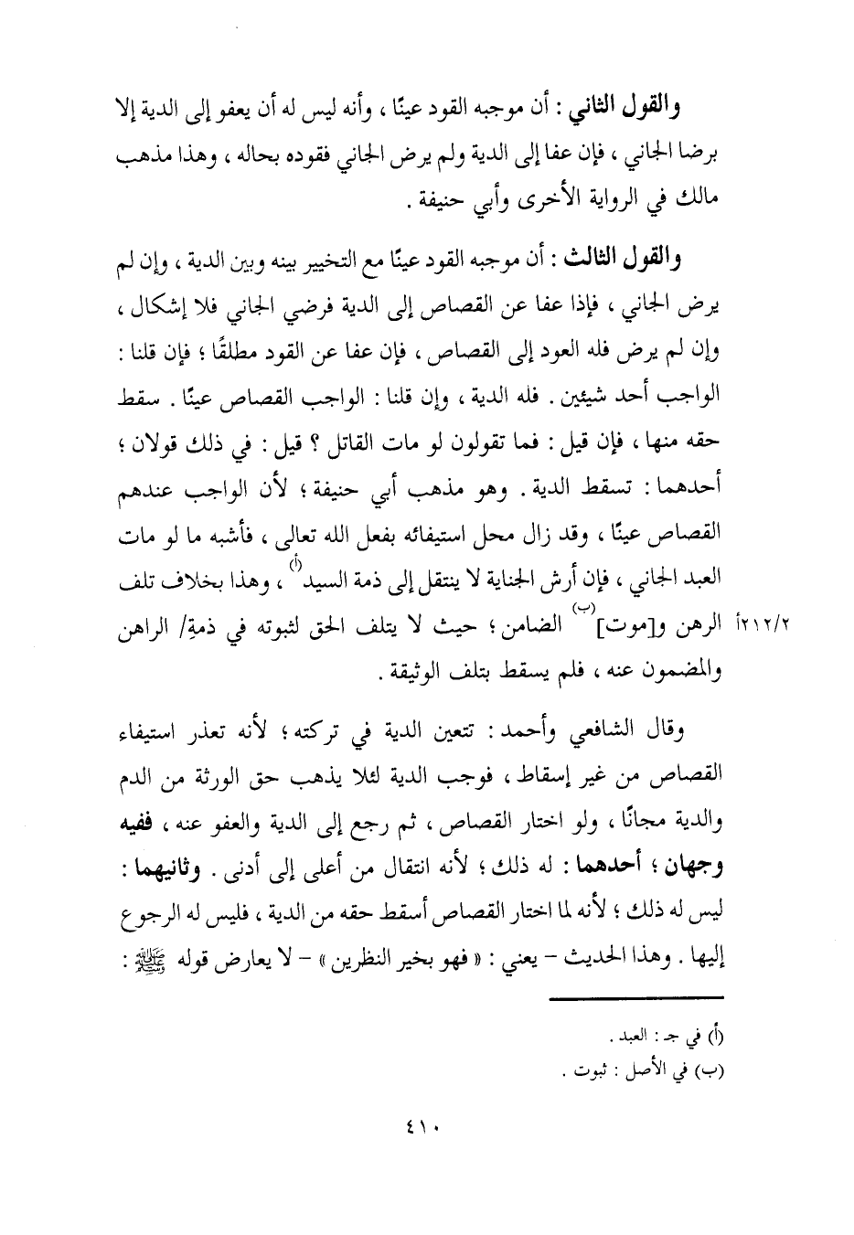 وقال الشافعي وأحمد: تتعين الدية في تركته؛ لأنه تعذر استيفاء القصاص من غير إسقاط، فوجا الدية لئلا يذهب حق الورثة من الدم والدية مجانًا، ولو اختار القصاص، ثم رجع إلى الدية والعفو عنه، ففيه وجهان؛ أحدهما: له ذلك؛ لأنه انتقال من أعلى إلى أدنى. وثانيهما: ليس له ذلك؛ لأنه لما اختار القصاص أسقط حقه من الدية، فليس له الرجوع إليها. وهذا الحديث -يعني: "فهو بخير النظرين"- لا يعارض قوله - صلى الله عليه وسلم -: