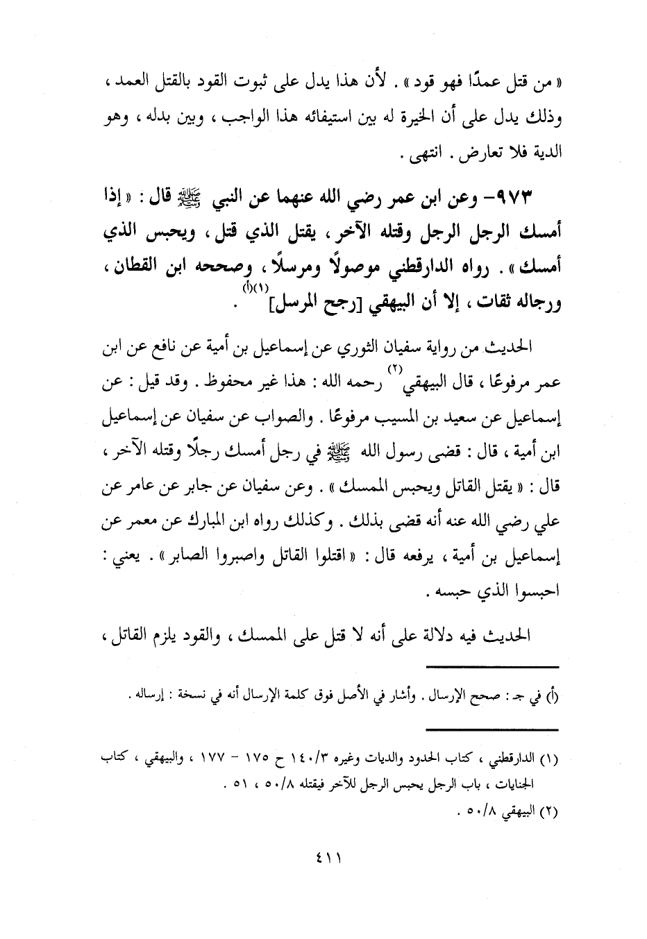 973 - وعن ابن عمر رضي الله عنهما عن النبي - صلى الله عليه وسلم - قال: "إذا أمسك الرجل الرجل وقتله الآخر، يقتل الذي قتل، ويحبس الذي أمسك". رواه الدارقطني موصولًا ومرسلًا، صححه ابن القطان، ورجاله ثقات، إلا أن البيهقي [رجح المرسل] (¬1) (أ).
