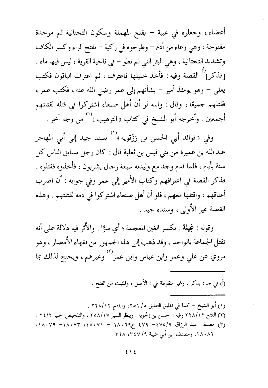 أعضاء، وجعلوه في عيبة -بفتح المهملة وسكون التحتانية ثم موحدة مفتوحة، وهي وعاء من أدم- وطرحوه في ركية -بفتح الراء وكسر الكاف وتشديد التحتانية، وهي البئر التي لم تطو- في ناحية القرية، ليس فيها ماء. [فذكر] (أ) القصة وفيه: فأخذ خليلها فاعترف، ثم اعترف الباقون فكتب يعلى -وهو يومئذ أمير- بشأنهم إلى عمر رضي الله عنه، فكتب عمر، فقتلهم جميعًا، وقال: والله لو أن أهل صنعاء اشتركوا في قتله لقتلتهم أجمعين. وأخرجه أبو الشيخ في كتاب "الترهيب" (¬1) من وجه آخر.