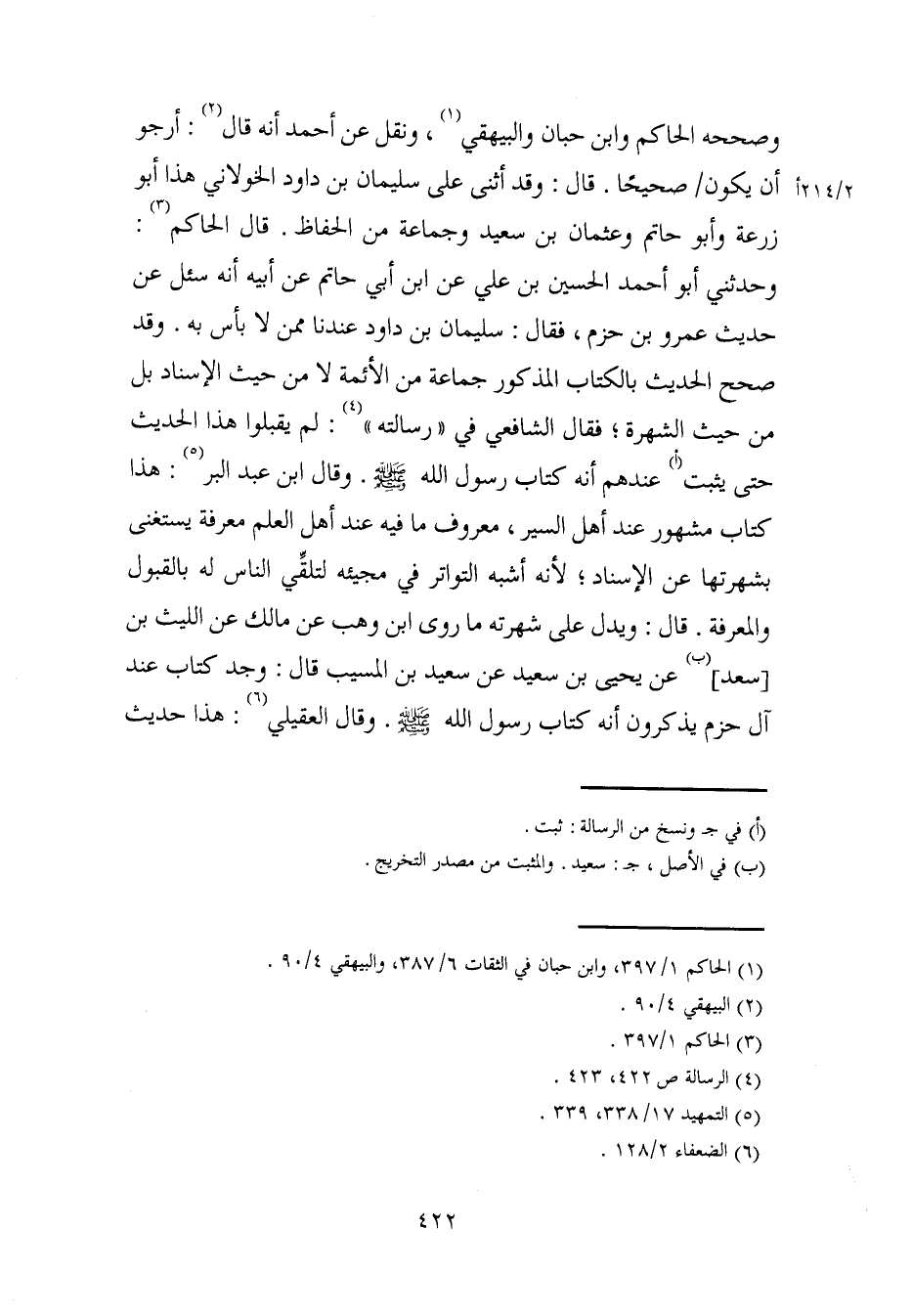 وصححه الحاكم وابن حبان والبيهقي (¬1)، ونقل عن أحمد أنه قال (¬2): أرجو أن يكون صحيحًا. قال: وقد أثنى على سليمان بن داود الخولاني هذا أبو زرعة وأبو حاتم وعثمان بن سعيد وجماعة من الحفاظ. قال الحاكم (¬3): وحدثني أبو أحمد الحسين بن علي عن ابن أبي حاتم عن أبيه أنه سئل عن حديث عمرو بن حزم، فقال: سليمان بن داود عندنا ممن لا بأس به. وقد صحح الحديث بالكتاب المذكور جماعة من الأئمة لا من حيث الإسناد بل من حيث الشهرة؛ فقال الشافعي في "رسالته" (¬4): لم يقبلوا هذا الحديث حتى يثبت (أ) عندهم أنه كتاب رسول الله - صلى الله عليه وسلم -. وقال ابن عبد البر (¬5): هذا كتاب مشهور عند أهل السير، معروف ما فيه عند أهل العلم معرفة يستغنى بشهرتها عن الإسناد؛ لأنه أشبه التواتر في مجيئه لتلقِّي الناس له بالقبول والمعرفة. قال: ويدل على شهرته ما روى ابن وهب عن مالك عن الليث بن [سعد] (ب) عن يحيى بن سعيد عن سعيد بن المسيب قال: وجد كتاب عند آل حزم يذكرون أنه كتاب رسول الله - صلى الله عليه وسلم -. وقال العقيلي (¬6): هذا حديث