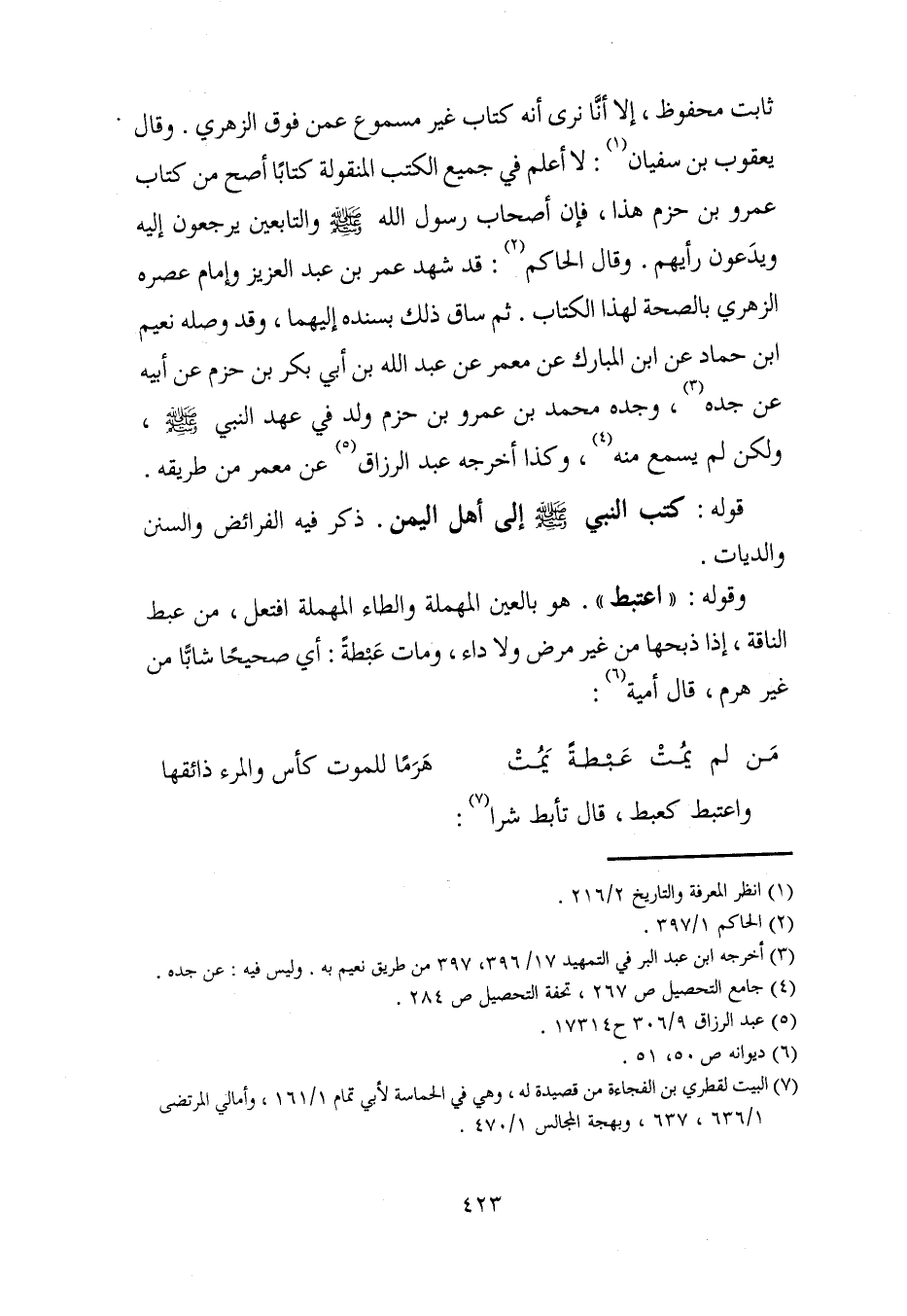 ثابت محفوظ، إلا أنَّا نرى أنه كتاب غير مسموخ عمن فوق الزهري. وقال يعقوب بن سفيان (¬1): لا أعلم في جميع الكتب المنقولة كتابًا أصح من كتاب عمرو بن حزم هذا، فإن أصحاب رسول الله - صلى الله عليه وسلم - والتابعين يرجعون إليه ويدَعون رأيهم. وقال الحاكم (¬2): قد شهد عمر بن عبد العزيز وإمام عصره الزهري بالصحة لهذا الكتاب. ثم ساق ذلك بسنده إليهما، وقد وصله نعيم بن حماد عن ابن المبارك عن معمر عن عبد الله بن أبي بكر بن حزم عن أبيه عن جده (¬3)، وجده محمد بن عمرو بن حزم ولد في عهد النبي - صلى الله عليه وسلم -، ولكن لم يسمع منه (¬4)، وكذا أخرجه عبد الرزاق (¬5) عن معمر من طريقه.