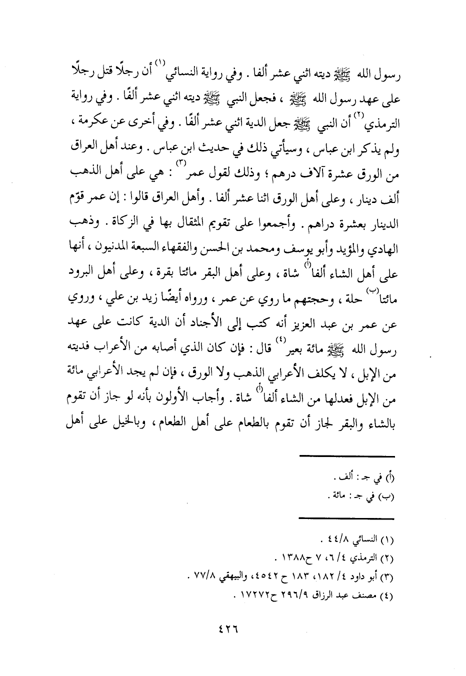 رسول الله - صلى الله عليه وسلم - ديته اثني عشر ألفا. وفي رواية النسائي (¬1) أن رجلًا قتل رجلًا على عهد رسول الله - صلى الله عليه وسلم -، فجعل النبي - صلى الله عليه وسلم - ديته اثني عشر ألفًا. وفي رواية الترمذي (¬2) أن النبي - صلى الله عليه وسلم - جعل الدية اثني عشر ألفًا. وفي أخرى عن عكرمة، ولم يذكر ابن عباس، وسيأتي ذلك في حديث ابن عباس. وعند أهل العراق من الورق عشرة آلاف درهم، وذلك لقول عمر (¬3): هي على أهل الذهب ألف دينار، وعلى أهل الورق اثنا عشر ألفا. وأهل العراق قالوا: إن عمر قوّم الدينار بعشرة دراهم. وأجمعوا على تقويم المثقال بها في الزكاة. وذهب الهادي والمؤيد وأبو يوسف ومحمد بن الحسن والفقهاء السبعة المدنيون، أنها على أهل الشاء ألفا (أ) شاة، وعلى أهل البقر مائتا بقرة، وعلى أهل البرود مائتا (ب) حلة، وحجتهم ما روي عن عمر، ورواه أيضًا زيد بن علي، وروي عن عمر بن عبد العزيز أنه كتب إلى الأجناد أن الدية كانت على عهد رسول الله - صلى الله عليه وسلم - مائة بعير (¬4) قال: فإن كان الذي أصابه من الأعراب فديته من الإبل، لا يكلف الأعرابي الذهب ولا الورق، فإن لم يجد الأعرابي مائة من الإبل فعدلها من الشاء ألفا (أ) شاة. وأجاب الأولون بأنه لو جاز أن تقوم بالشاء والبقر لجاز أن تقوم بالطعام على أهل الطعام، وبالخيل على أهل