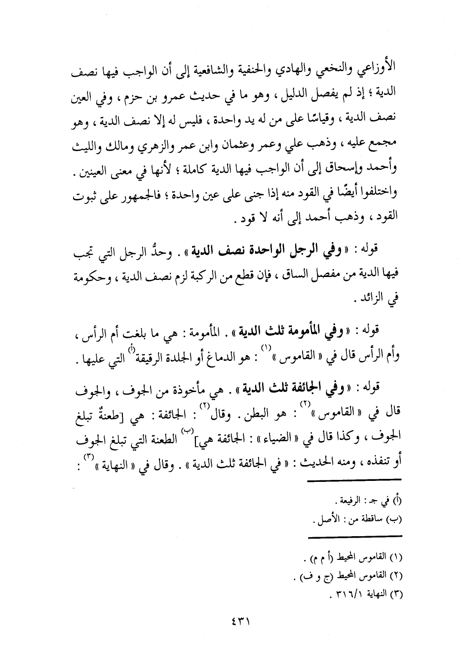 قوله؛ "وفي المأمومة ثلث الدية". المأمومة: هي ما بلغت أم الرأس، وأم الرأس قال في "القاموس" (¬1): هو الدماغ أو الجلدة الرقيقة (أ) التي عليها.