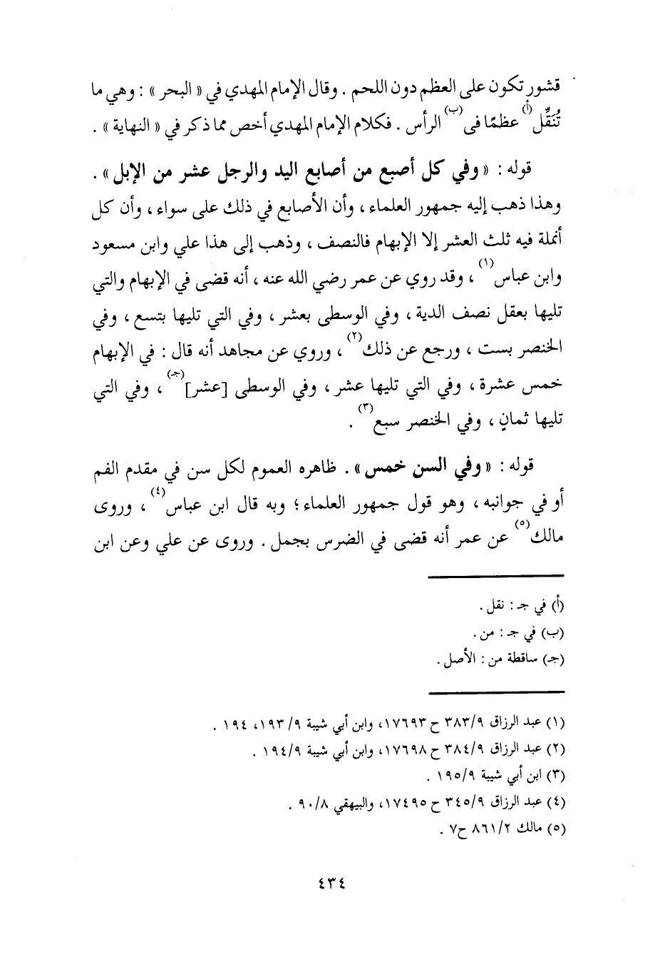 وهذا ذهب إليه جمهور العلماء، وأن الأصابع في ذلك على سواء، وأن كل أنملة فيه ثلث العشر إلا الإبهام فالنصف، وذهب إلى هذا علي وابن مسعود وابن عباس (¬1)، وقد روي عن عمر رضي الله عنه، أنه قضى في الإبهام والتي تليها بعقل نصف الدية، وفي الوسطى بعشر، وفي التي تليها بتسع، وفي الخنصر بست، ورجع عن ذلك (¬2)، وروي عن مجاهد أنه قال: في الإبهام خمس عشرة، وفي التي تليها عشر، وفي الوسطى [عشر] (جـ)، وفي التي تليها ثمانٍ، وفي الخنصر سبع (¬3).