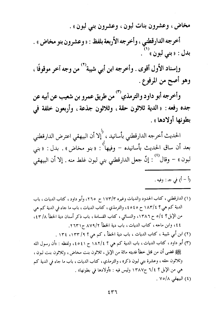 (¬3) أبو داود، كتاب الديات، باب الدية كم هي؟ 4/ 182 ح 4541، ولفظه: "أن رسول الله - صلى الله عليه وسلم - قضى أن من قتل خطأ فديته مائة من الإبل، ثلاثون بنت مخاض، وثلاثون بنت لبون، وثلاثون حقه، وعشرة بني لبون ذكرًا، والترمذي، كتاب الديات، باب ما جاء في الدية كم هي من الإِبل؟ 4/ 6 ح 1387 وليس فيه: "أولادها في بطونها".