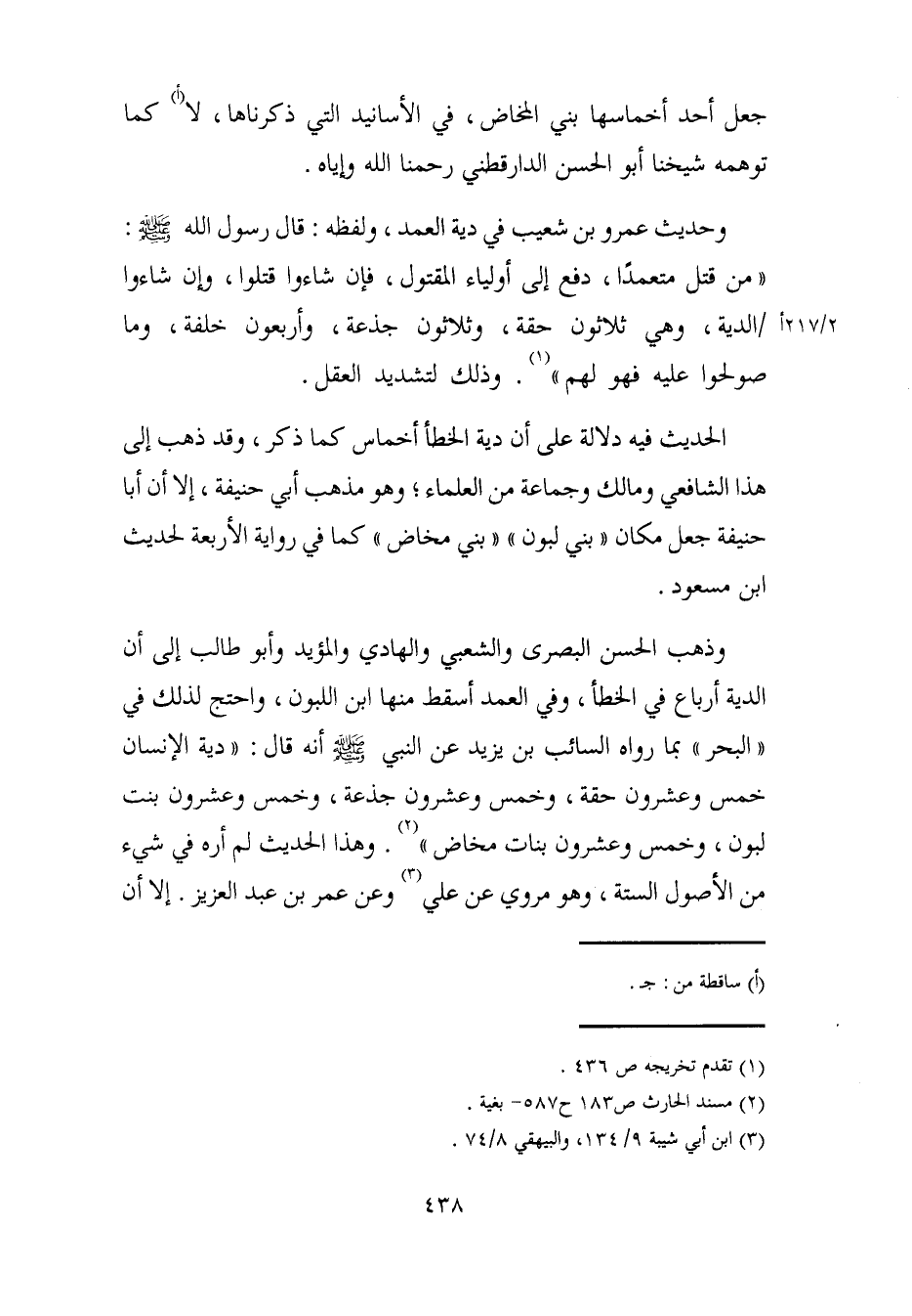 جعل أحد أخماسها بني المخاض، في الأسانيد التي ذكرناها، لا (أ) كما توهمه شيخنا أبو الحسنن الدارقطني رحمنا الله وإياه.