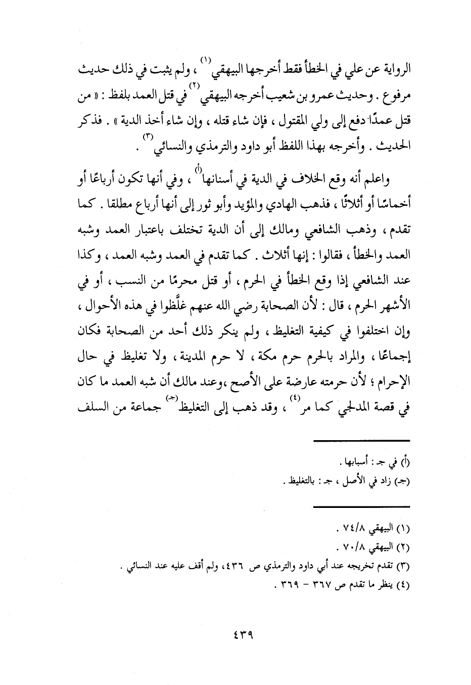 الرواية عن علي في الخطأ فقط أخرجها البيهقي (¬1)، ولم يثبت في ذلك حديث مرفوع. وحديث عمرو بن شعيب أخرجه البيهقي (¬2) في قتل العمد بلفظ: "من قتل عمدًا دفع إلى ولي المقتول، فإن شاء قتله، وإن شاء أخذ الدية". فذكر الحديث. وأخرجه بهذا اللفظ أبو داود والترمذي والنسائي (¬3).