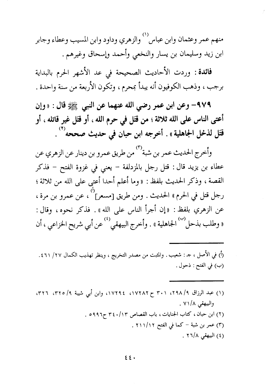 979 - وعن ابن عمر رضي الله عنهما عن النبي - صلى الله عليه وسلم - قال: "وإن أعتى الناس على الله ثلاثة، من قتل في حرم الله، أو قتل غير قاتله، أو قتَل لذحْل الجاهلية". أخرجه ابن حبان في حديث صححه (¬2).