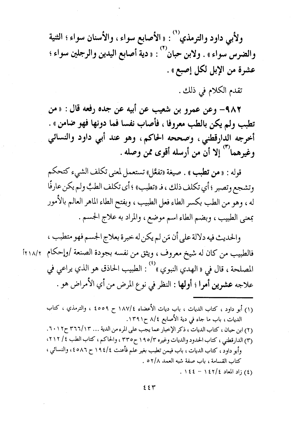 (¬3) الدارقطني، كتاب الحدود والديات وغيره 3/ 195 ح 335، والحاكم، كتاب الطب 4/ 212، وأبو داود، كتاب الديات، باب فيمن تطبب بغير علم فأعنت 4/ 194 ح 4586، والنسائي، كتاب القسامة، باب صفة شبه العمد 8/ 52.