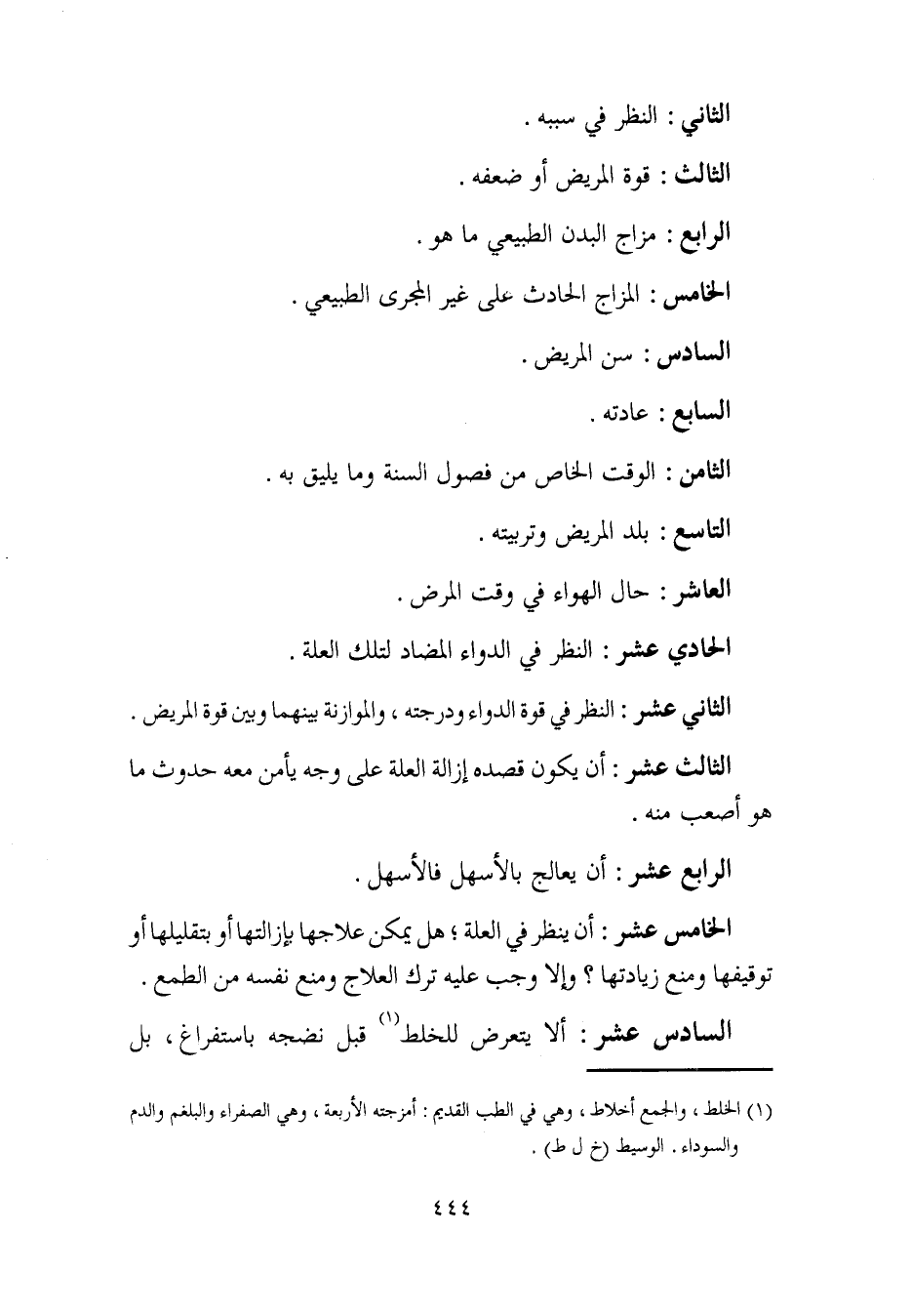الخامس عشر: أن ينظر في العلة؛ هل يمكن علاجها بإزالتها أو بتقليلها أو توقيفها ومنع زيادتها؟ وإلا وجب عليه ترك العلاج ومنع نفسه من الطمع.