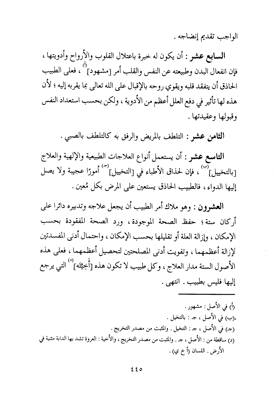 التاسع عشر: أن يستعمل أنواع العلاجات الطبيعية والإلهية والعلاج [بالتخييل] (ب)، فإن لحذاق الأطباء في [التخييل] (جـ) أمورًا عجيبة ولا يصل إليها الدواء، فالطيب الحاذق يستعين على المرض بكل مُعين.