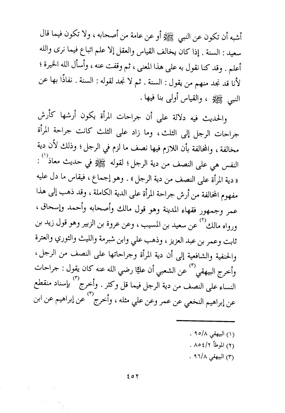 أشبه أن تكون عن النبي - صلى الله عليه وسلم - أو عن عامة من أصحابه، ولا تكون فيما قال سعيد: السنة. إذا كان كان يخالف القياس والعقل إلا علم اتباع فيما نرى والله أعلم. وقد كنا نقول به على هذا المعنى، ثم وقفت عنه، وأسأل الله الخيرة؛ لأنا قد نجد منهم من يقول: السنة. ثم لا نجد لقوله: السنة. نفاذًا بها عن النبي - صلى الله عليه وسلم -، والقياس أولى بنا فيها.