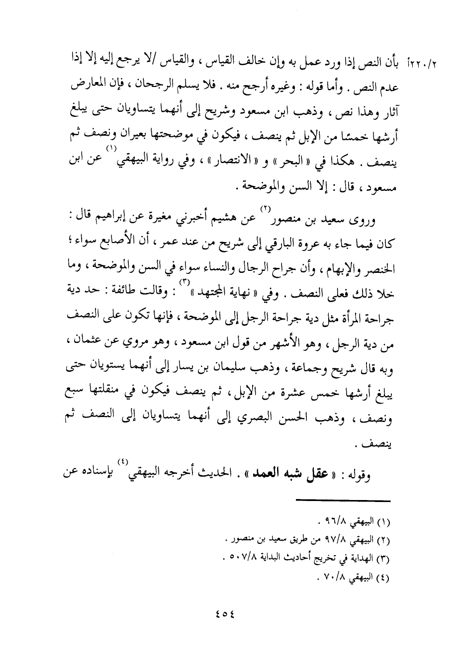 بأن النص إذا ورد عمل به وإن خالف القياس، والقياس لا يرجع إليه إلا إذا عدم النص. وأما قوله: وغيره أرجح منه. فلا يسلم الرجحان، فإن المعارض آثار وهذا نص، وذهب ابن مسعود وشريح إلى أنهما يتساويان حتى يبلغ أرشها خمسًا من الإبل ثم ينصف، فيكون في موضحتها بعيران ونصف ثم ينصف. هكذا في "البحر" و"الانتصار"، وفي رواية البيهقي (¬1) عن ابن مسعود، قال: إلا السن والموضحة.