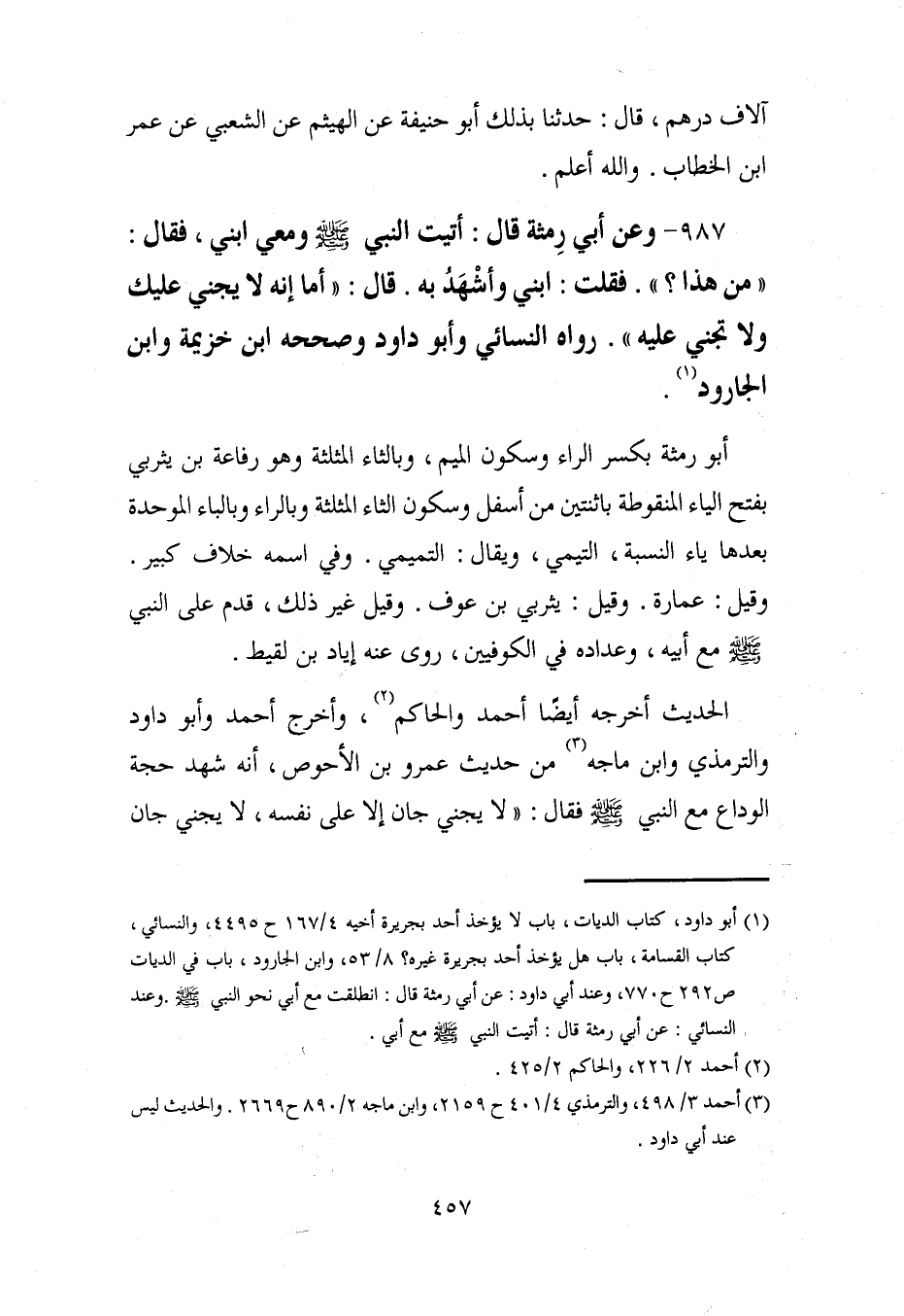 987 - وعن أبي رِمثة قال: أتيت النبي - صلى الله عليه وسلم - ومعي ابني، فقال: "من هذا؟ ". فقلت: ابني وأشْهَدُ به. قال: "أما إنه لا يجني عليك ولا تجني عليه". رواه النسائي وأبو داود وصححه ابن خزيمة وابن الجارود (¬1).