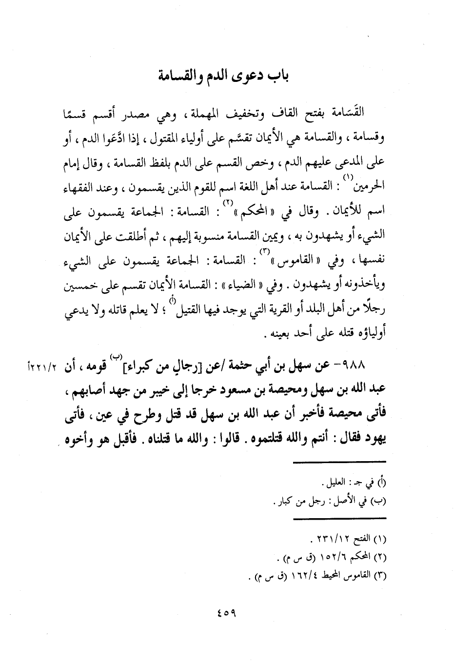 988 - عن سهل بن أبي حثمة عن [رجالٍ من كبراء] (ب) قومه، أن عبد الله بن سهل ومحيصة بن مسعود خرجا إلى خيبر من جهد أصابهم، فأتى محيصة فأخبر أن عبد الله بن سهل قد قتل وطرح في عين، فأتى يهود فقال: أنتم والله قتلتموه. قالوا: والله ما قتلناه. فأقبل هو وأخوه
