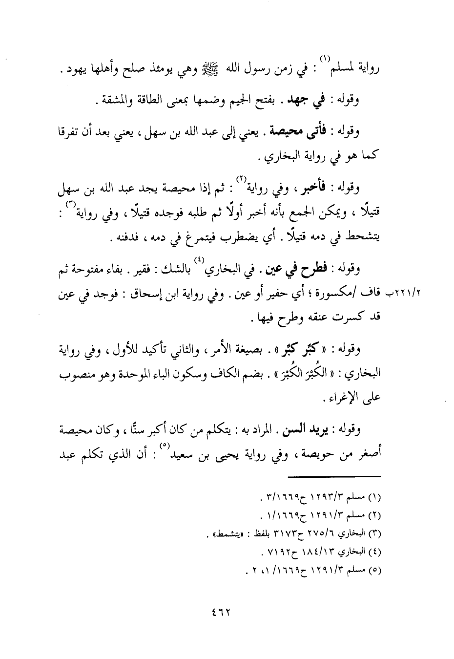 وقوله: يريد السن. المراد به: يتكلم من كان أكبر سنًّا، وكان محيصة أصغر من حويصة، وفي رواية يحيى بن سعيد (¬5): أن الذي تكلم عبد