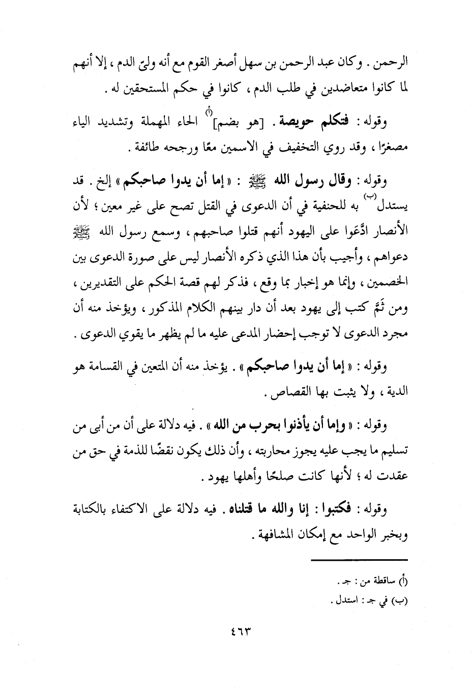 وقوله: وقال رسول الله - صلى الله عليه وسلم -: "إما أن يدوا صاحبكم" إلخ. قد يستدل (ب) به للحنفية في أن الدعوى في القتل تصح على غير معين؛ لأن الأنصار ادَّعَوا على اليهود أنهم قتلوا صاحبهم، وسمع رسول الله - صلى الله عليه وسلم - دعواهم، وأجيب بأن هذا الذي ذكره الأنصار ليس على صورة الدعوى بين الخصمين، وإنما هو إخبار بما وقع، فذكر لهم قصة الحكم على التقديرين، ومن ثَمَّ كتب إلى يهود بعد أن دار بينهم الكلام المذكور، ويؤخذ منه أن مجرد الدعوى لا توجب إحضار المدعى عليه ما لم يظهر ما يقوي الدعوى.