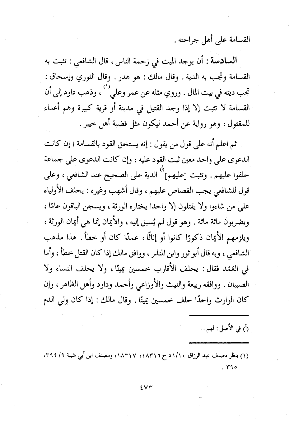 السادسة: أن يوجد الميت في زحمة الناس، قال الشافعي: تثبت به القسامة وتجب به الدية. وقال مالك: هو هدر. وقال الثوري وإسحاق: تجب ديته في بيت المال. وروي مثله عن عمر وعلي (¬1)، وذهب داود إلى أن القسامة لا تثبت إلا إذا وجد القتيل في مدينة أو قرية كبيرة وهم أعداء للمقتول، وهو رواية عن أحمد ليكون مثل قضية أهل خيبر.
