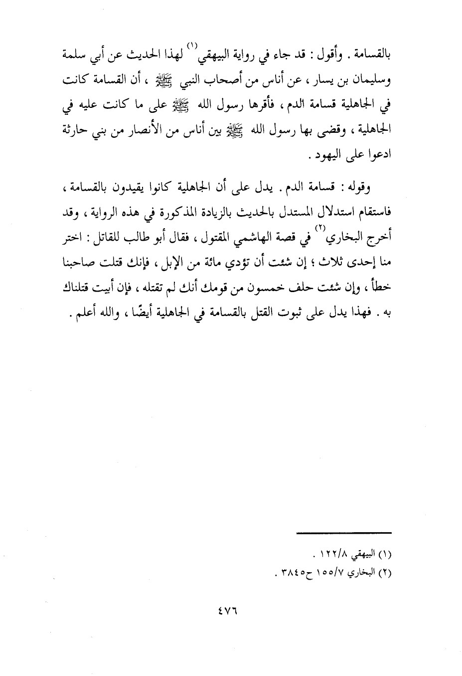 بالقسامة. وأقول: قد جاء في رواية البيهقي (¬1) لهذا الحديث عن أبي سلمة وسليمان بن يسار، عن أناس من أصحاب النبي - صلى الله عليه وسلم -، أن القسامة كانت في الجاهلية قسامة الدم، فأقرها رسول الله - صلى الله عليه وسلم - على ما كانت عليه في الجاهلية، وقضى بها رسهول الله - صلى الله عليه وسلم - بين أناس من الأنصار من بني حارثة ادعوا على اليهود.