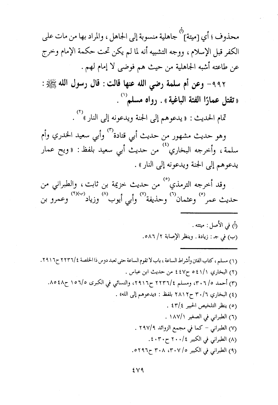 992 - وعن أم سلمة رضي الله عنها قالت: قال رسول الله - صلى الله عليه وسلم -: "تقتل عمارًا الفئة الباغية". رواه مسلم (¬1).