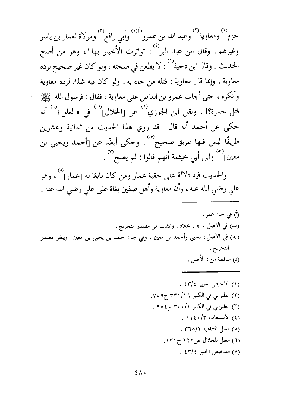 حزم (¬1) ومعاوية (¬2) وعبد الله بن عمرو (أ) (1) وأبي رافع (¬3) ومولاة لعمار بن ياسر وغيرهم. وقال ابن عبد البر (¬4): تواترت الأخبار بهذا، وهو من أصح الحديث. وقال ابن دحية (1): لا يطعن في صحته، ولو كان غير صحيح لرده معاوية، وإنما قال معاوية: قتله من جاء به. ولو كان فيه شك لرده معاوية وأنكره، حتى أجاب عمرو بن العاص على معاوية، فقال: فرسول الله - صلى الله عليه وسلم - قتل حمزة؟!. ونقل ابن الجوزي (¬5) عن [الخلال] (ب) في "العلل" (¬6) أنه حكى عن أحمد أنه قال: قد روي هذا الحديث من ثمانية وعشرين طريقًا ليس فيها طريق صحيح (جـ). وحكى أيضًا عن [أحمد ويحيى بن معين] (جـ) وابن أبي خيثمة أنهم قالوا: لم يصح (¬7).