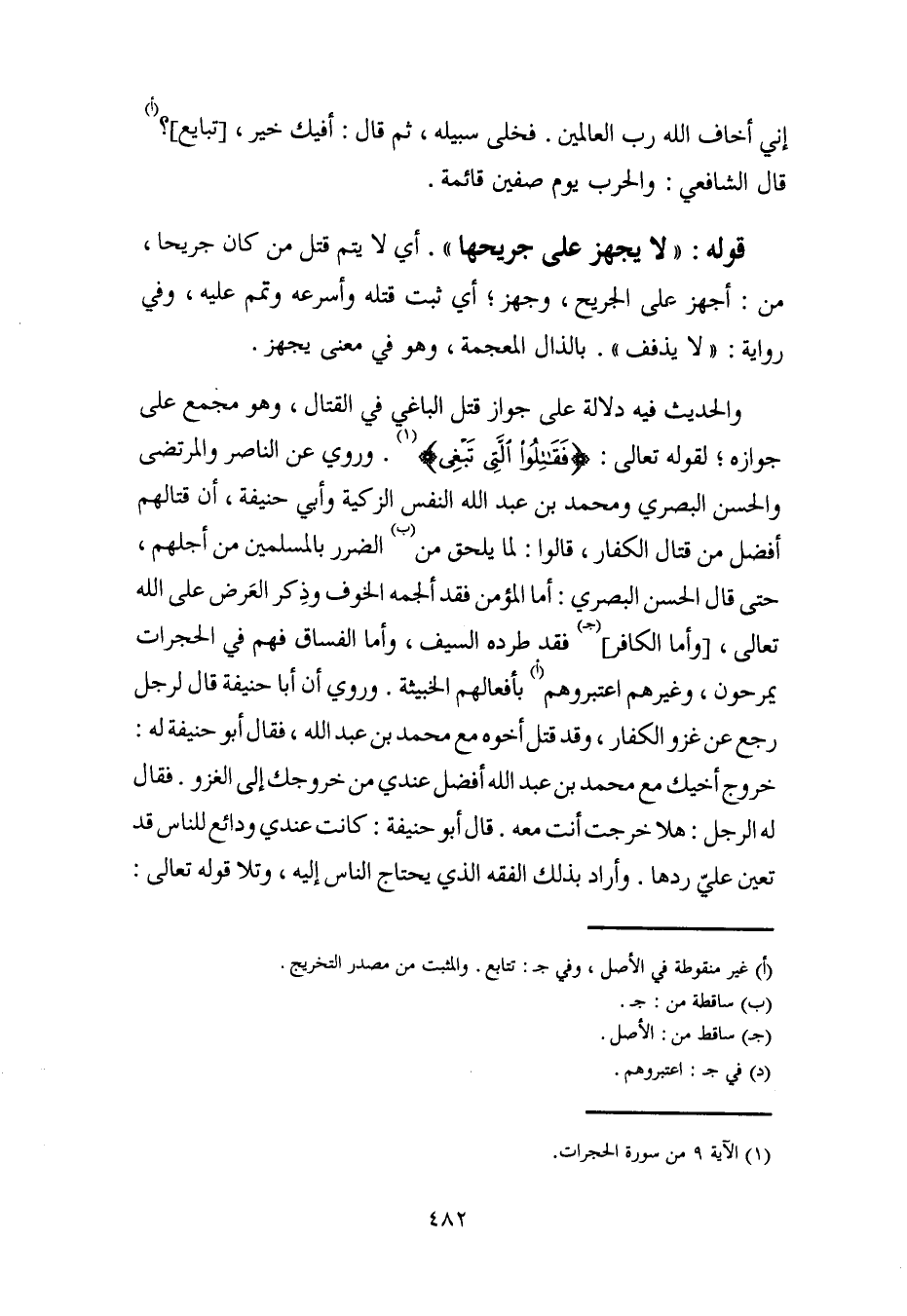 والحديث فيه دلالة على جواز قتل الباغي في القتال، وهو مجمع على جوازه؛ لقوله تعالى: {فَقَاتِلُوا الَّتِي تَبْغِي} (¬1). وروي عن الناصر والمرتضى والحسن البصري ومحمد بن عبد الله النفس الزكية وأبي حنيفة، أن قتالهم أفضل من قتال الكفار، قالوا: لما يلحق من (ب) الضرر بالمسلمين من أجلهم، حتى قال الحسن البصري: أما المؤمن فقد ألجمه الخوف وذِكر العَرض على الله تعالى، [وأما الكافر] (جـ) فقد طرده السيف، وأما الغساق فهم في الحجرات يمرحون، وغيرهم اعتبروهم (أ) بأفعالهم الخبيثة. وروي أن أبا حنيفة قال لرجل رجع عن غزو الكفار، وقد قتل أخوه مع محمد بن عبد الله، فقال أبو حنيفة له: خروج أخيك مع محمد بن عبد الله أفضل عندي من خروجك إلى الغزو. فقال له الرجل: هلا خرجت أنت معه. قال أبو حنيفة: كانت عندي ودائع للناس قد تعين عليّ ردها. وأراد بذلك الفقه الذي يحتاج الناس إليه، وتلا قوله تعالى: