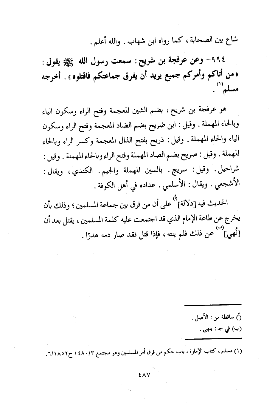 994 - وعن عرفجة بن شريح: سمعت رسول الله - صلى الله عليه وسلم - يقول: "من أتاكم وأمركم جميع يريد أن يفرق جماعتكم فاقتلوه". أخرجه مسلم (¬1).