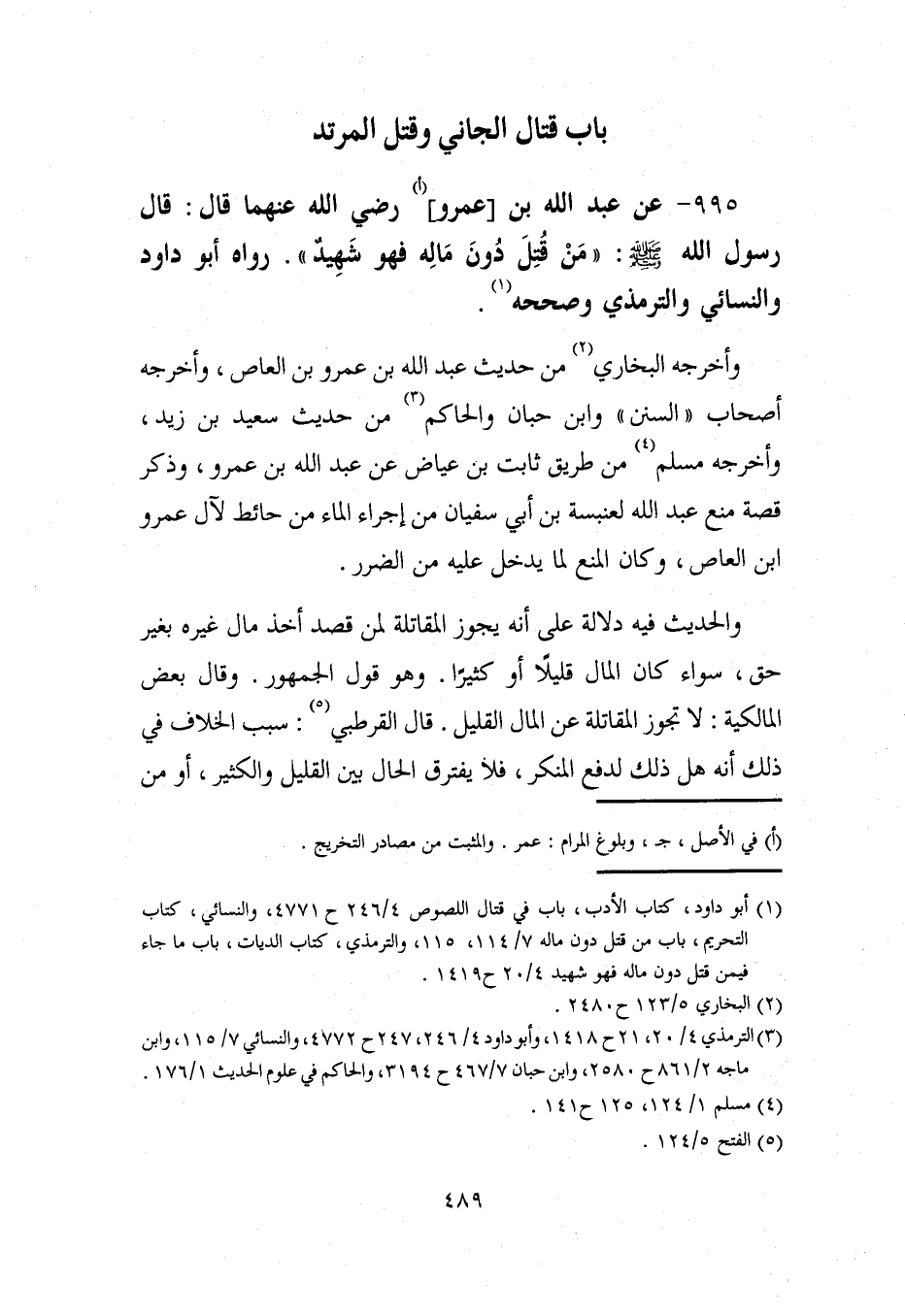 (¬1) أبو داود، كناب الأدب، باب في قتال اللصوص 4/ 246 ح 4771، والنسائي، كتاب التحريم، باب من قتل دون ماله 7/ 114، 115، والترمذي، كتاب الديات، باب ما جاء فيمن قتل دون ماله فهو شهيد 4/ 20 ح 1419.