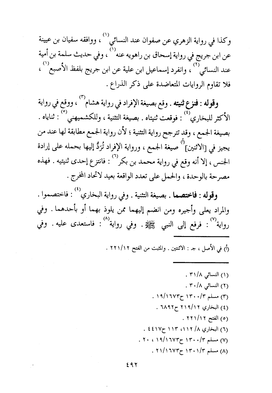 وكذا في رواية الزهري عن صفوان عند النسائي (¬1)، ووافقه سفيان بن عيينة عن ابن جريج في رواية إسحاق بن راهويه عنه (1)، وفي حديث سلمة بن أمية عند النسائي (¬2)، وانفرد إسماعيل ابن علية عن ابن جريج بلفظ الأصبع (1)، فلا تقاوم الروايات المتعاضدة على ذكر الذراع.
