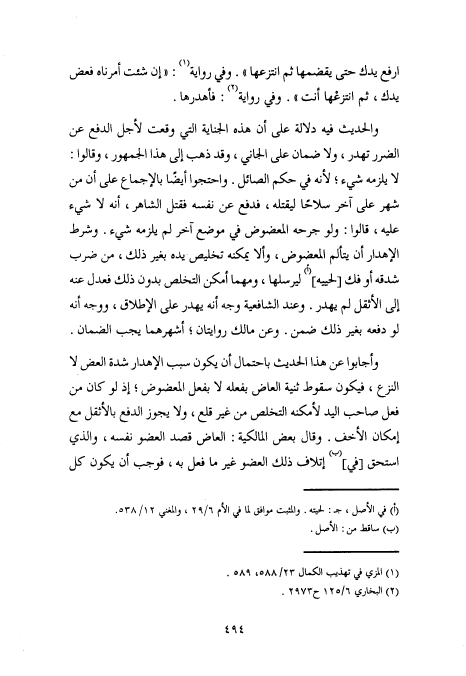 والحديث فيه دلالة على أن هذه الجناية التي وقعت لأجل الدفع عن الضرر تهدر، ولا ضمان على الجاني، وقد ذهب إلى هذا الجمهور، وقالوا: لا يلزمه شيء؛ لأنه في حكم الصائل. واحتجوا أيضًا بالإجماع على أن من شهر على آخر سلاحًا ليقتله، فدفع عن نفسه فقتل الشاهر، أنه لا شيء عليه، قالوا: ولو جرحه المعضوض في موضع آخر لم يلزمه شيء. وشرط الإهدار أن يتألم المعضوض، وألا يمكنه تخليص يده بغير ذلك، من ضرب شدقه أو فك [لحييه] (أ) ليرسلها، ومهما أمكن التخلص بدون ذلك فعدل عنه إلى الأثقل لم يهدر. وعند الشافعية وجه أنه يهدر على الإطلاق، ووجه أنه لو دفعه بغير ذلك ضمن. وعن مالك روايتان؛ أشهرهما يجب الضمان.