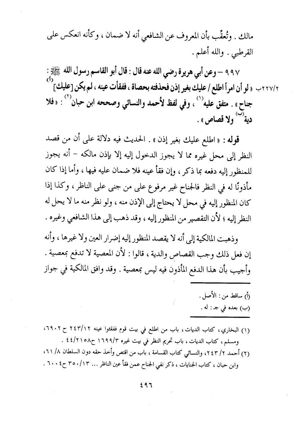 (¬1) البخاري، كتاب الديات، باب من اطلع في بيت قوم ففقئوا عينه 12/ 243 ح 6902، ومسلم، كتاب الديات، باب تحريم النظر في بيت غيره 3/ 1699 ح 2158/ 44.