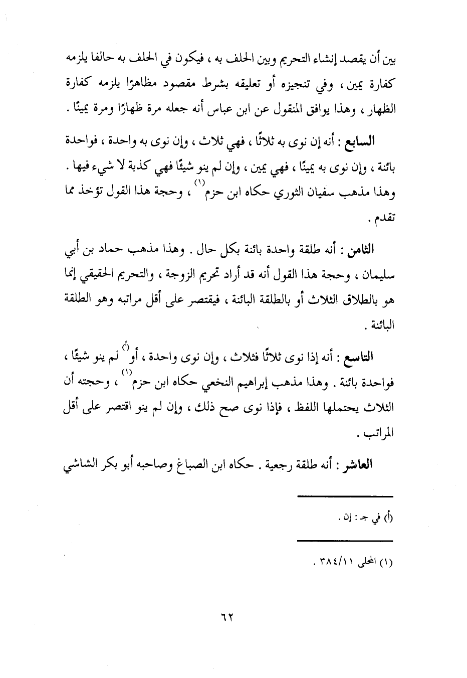 الثامن: أنه طلقة واحدة بائنة بكل حال. وهذا مذهب حماد بن أبي سليمان، وحجة هذا القول أنه قد أراد تحريم الزوجة، والتحريم الحقيقي إنما هو بالطلاق الثلاث أو بالطلقة البائنة، فيقتصر على أقل مراتبه وهو الطلقة البائنة.