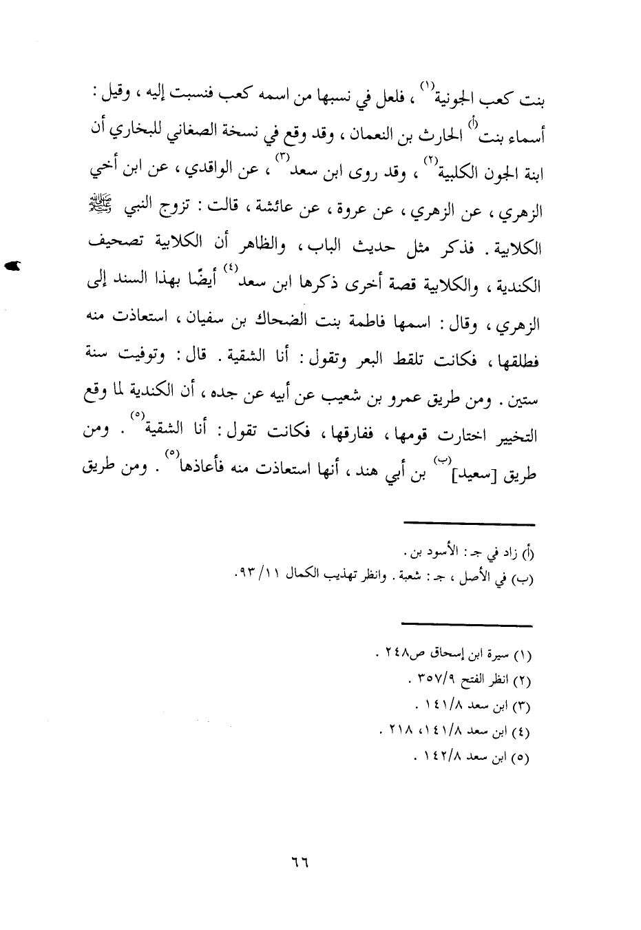 بنت كعب الجونية (¬1)، فلعل في نسبها من اسمه كعب فنسبت إليه، وقيل: أسماء بنت (أ) الحارث بن النعمان، وقد وقع في نسخة الصغاني للبخاري أن ابنة الجون الكلبية (¬2)، وقد روى ابن سعد (¬3)، عن الواقدي، عن ابن أخي الزهري، عن الزهري، عن عروة، عن عائشة، قالت: تزوج النبي - صلى الله عليه وسلم - الكلابية. فذكر مثل حديث الباب، والظاهر أن الكلابية تصحيف الكندية، والكلابية قصة أخرى ذكرها ابن سعد (¬4) أيضًا بهذا السند إلى الزهري، وقال: اسمها فاطمة بنت الضحاك بن سفيان، استعاذت منه فطلقها، فكانت تلقط البعر وتقول: أنا الشقية. قال: وتوفيت سنة ستين. ومن طريق عمرو بن شعيب عن أبيه عن جده، أن الكندية لما وقع التخيير اختارت قومها، ففارقها، فكانت تقول: أنا الشقية (¬5). ومن طريق [سعيد] (ب) بن أبي هند، أنها استعاذت منه فأعاذها (5). ومن طريق